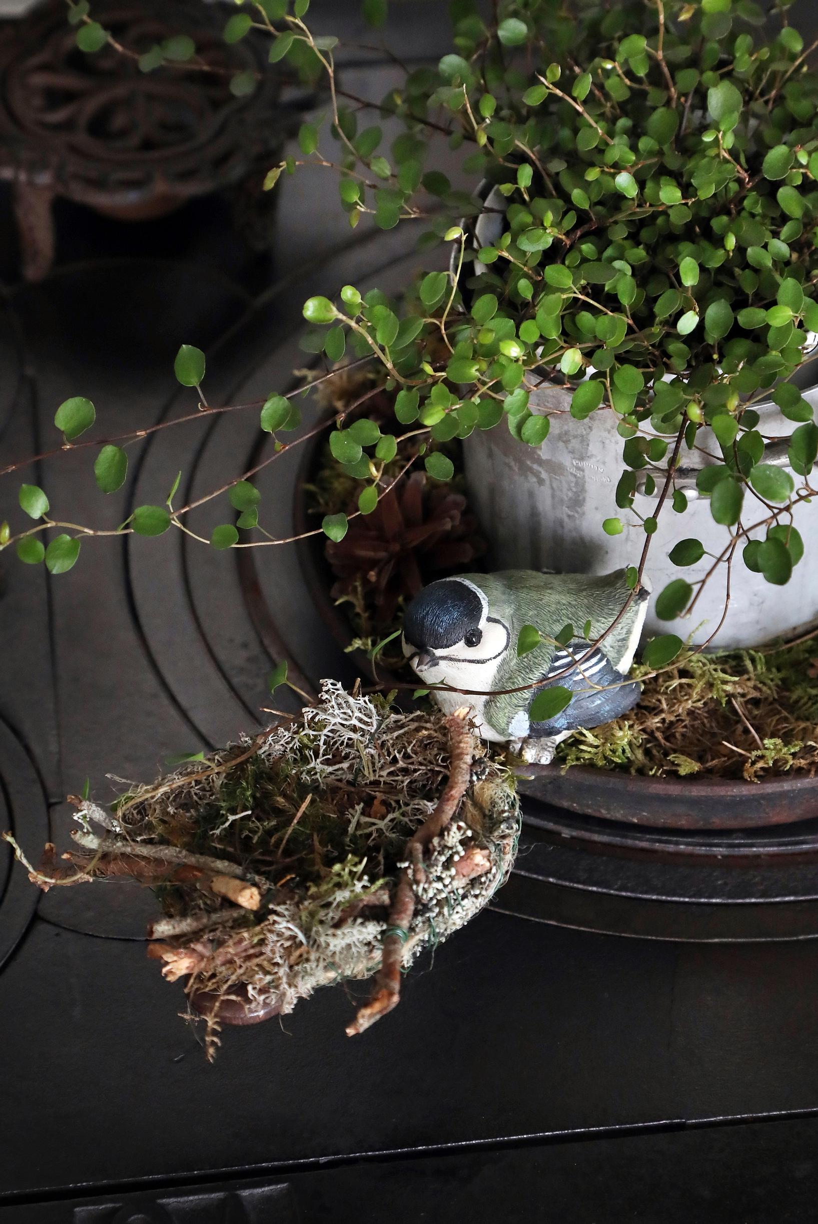 Pikkuruinen sinitiainen kierrätyskeskuksesta teki kesäpesän valurautapannuun puuhellan päälle.