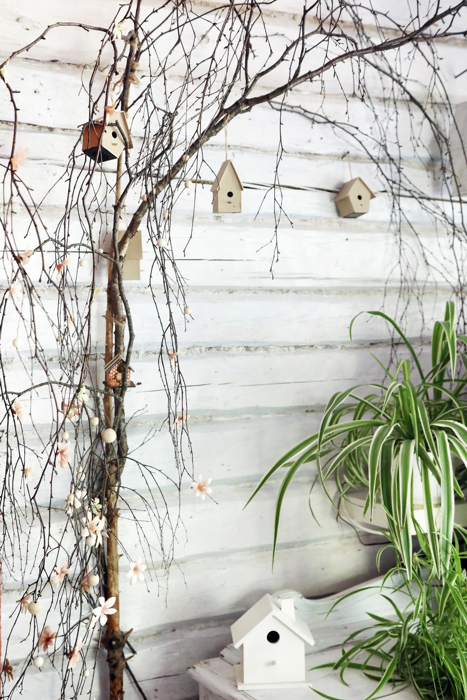 Olohuoneen koivunoksaan on ripustettu askartelukaupasta ja kirppiksiltä löytyneitä pikkuisia linnunpönttöjä ja silkkikukkia, jotka on liimattu yksitellen oksaan.