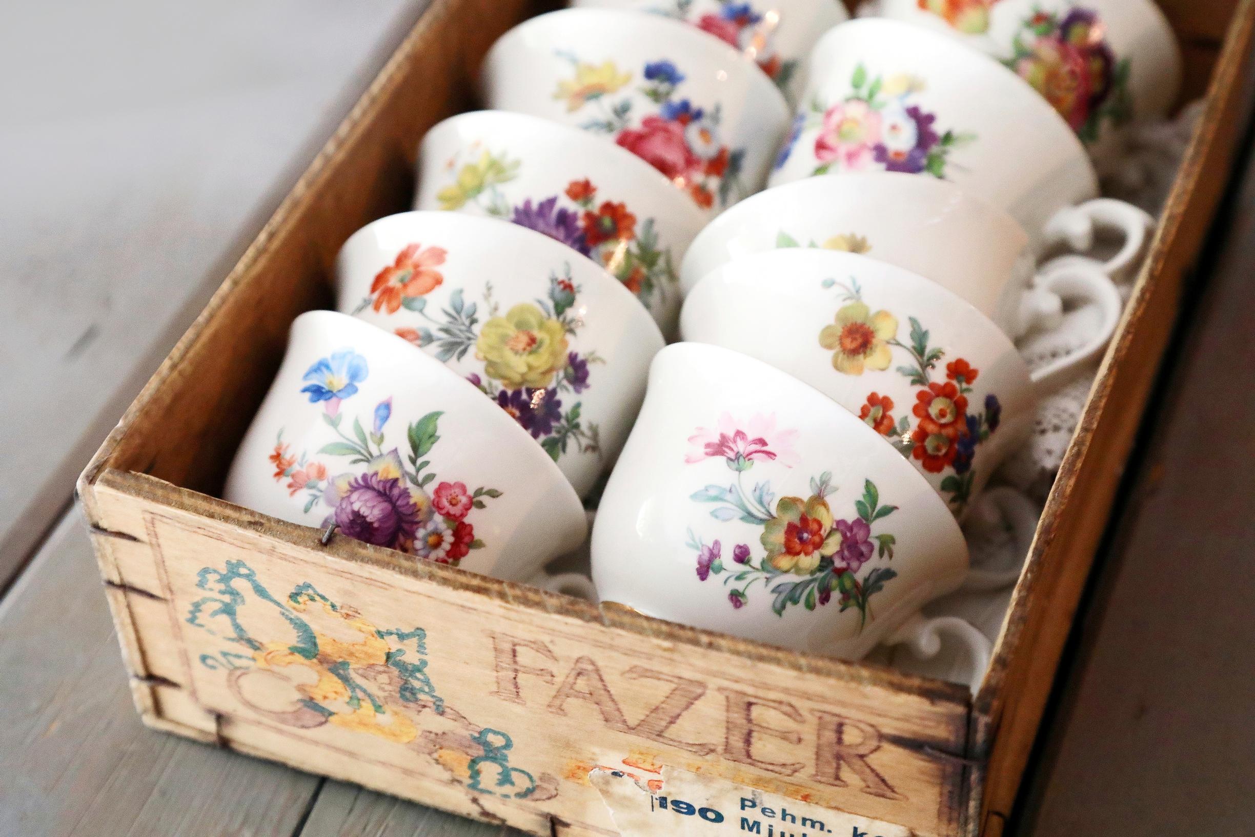 Annen heikkoutena ovat kauniit, vanhat astiat. Fazerin puulaatikossa on Kulta-aika-kuppeja.