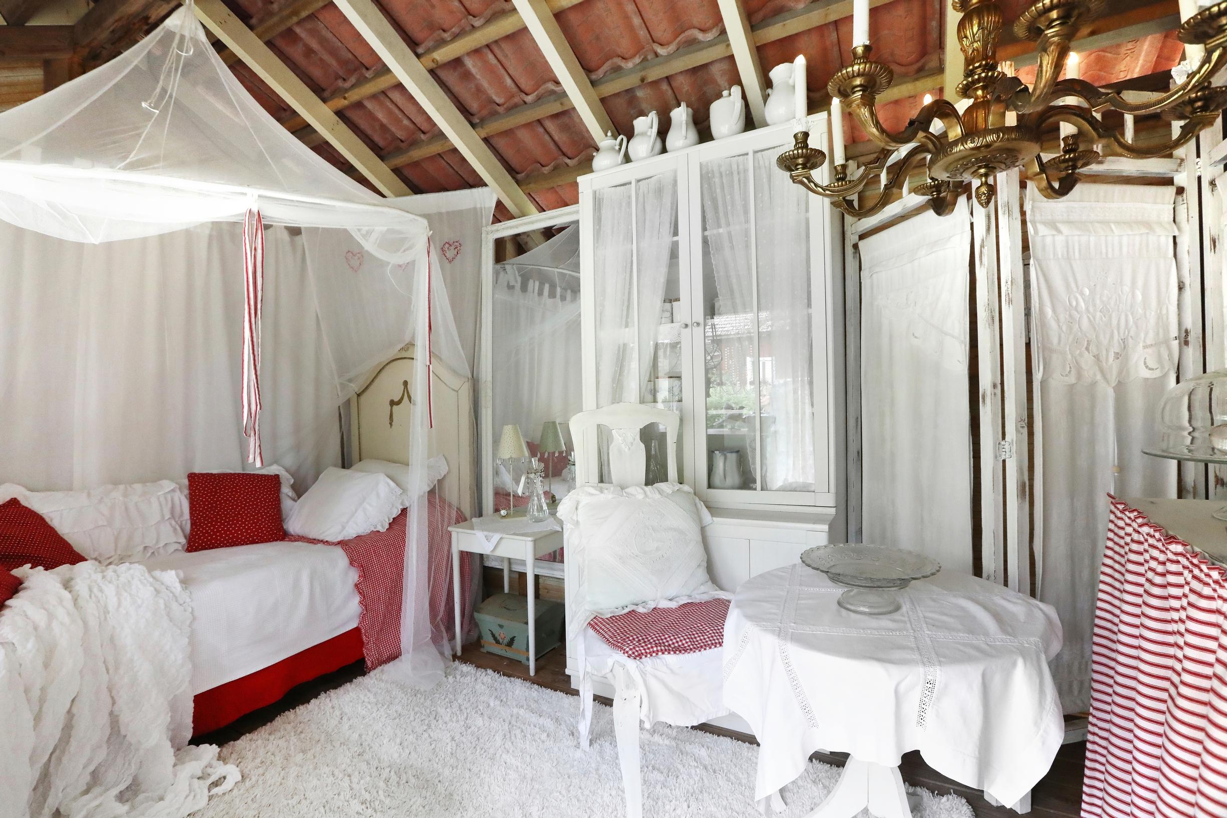 Anne on sisustanut piharakennuksen vierashuoneen kirppislöydöillä. Yövieraat ovat viihtyneet.