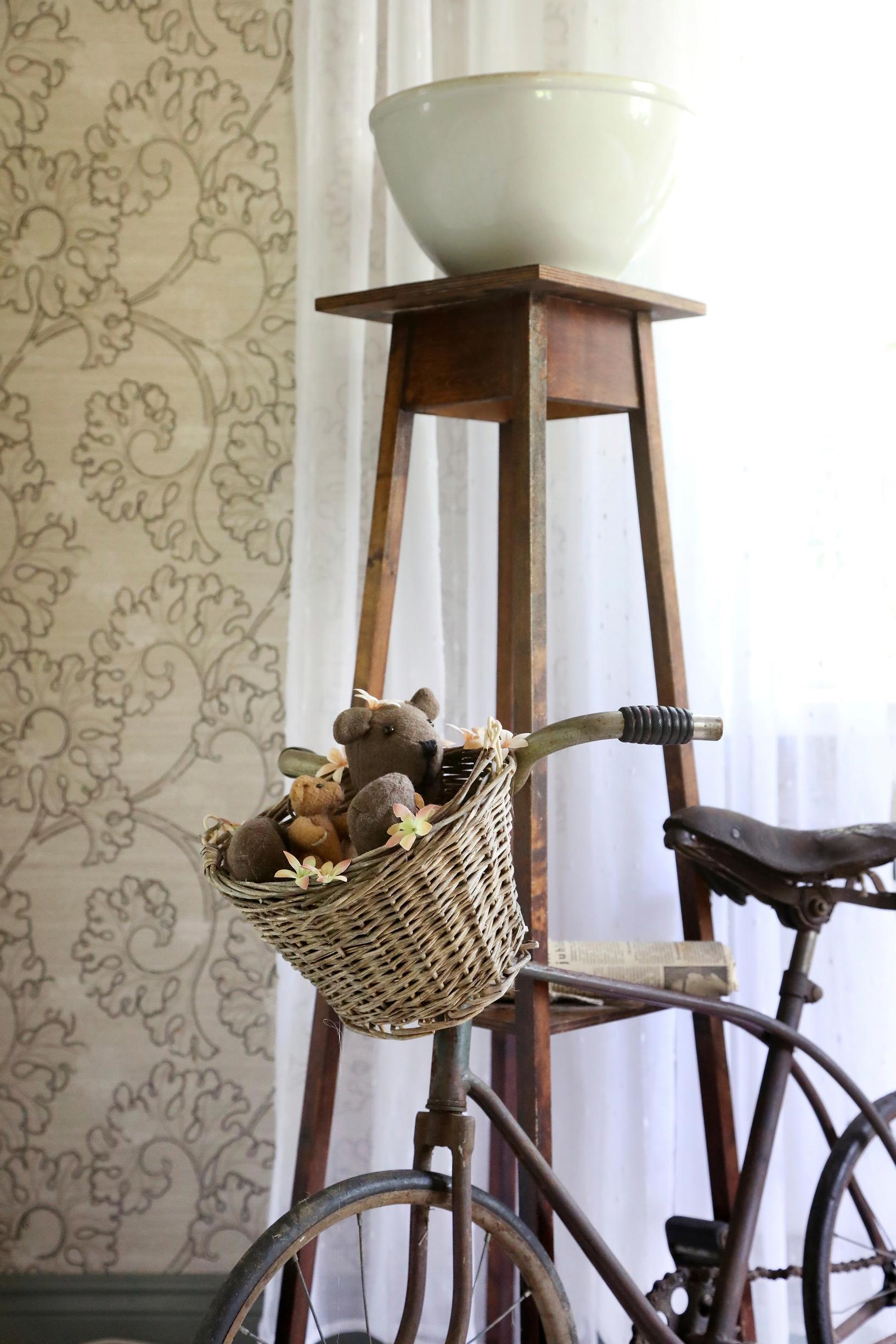 Kirppispyörän kyydissä istuvat vanhasta villasta tehty nalle, kainalossaan pieni ystävä. Molemmat on adoptoitu kirpputoreilta. Kukkapöytä on löytö Loviisan Wanhat Talot -tapahtumasta.