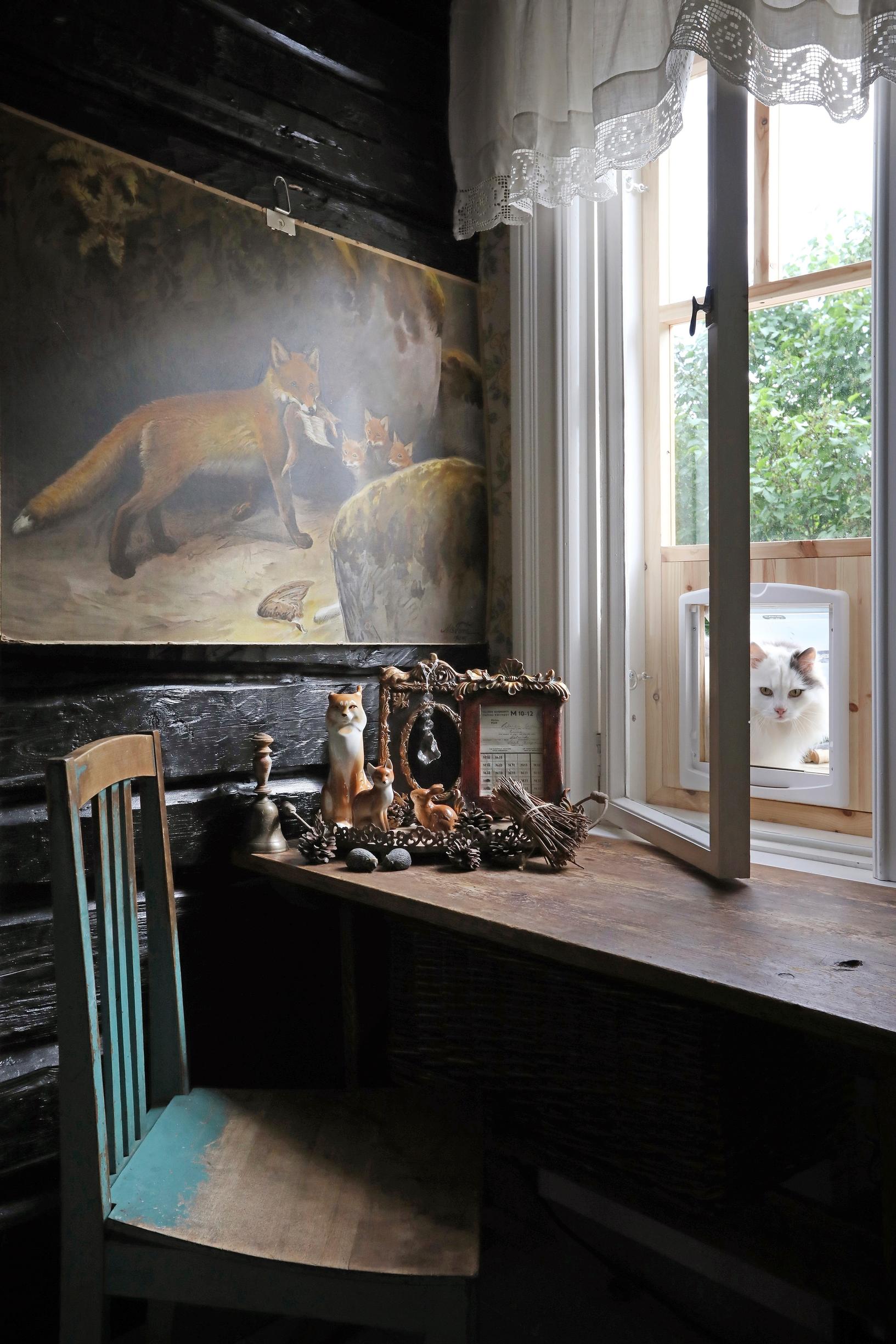 Pöytä on Annen äidinäidin siskonmiehen tekemä, tuoli viiden euron löytö. Opetustaulu ja eläinhahmot ovat kirppiksiltä. Ilves, kettu ja pupu ovat Lomonosovin posliinia. Otto kurkkii kissanluukusta.