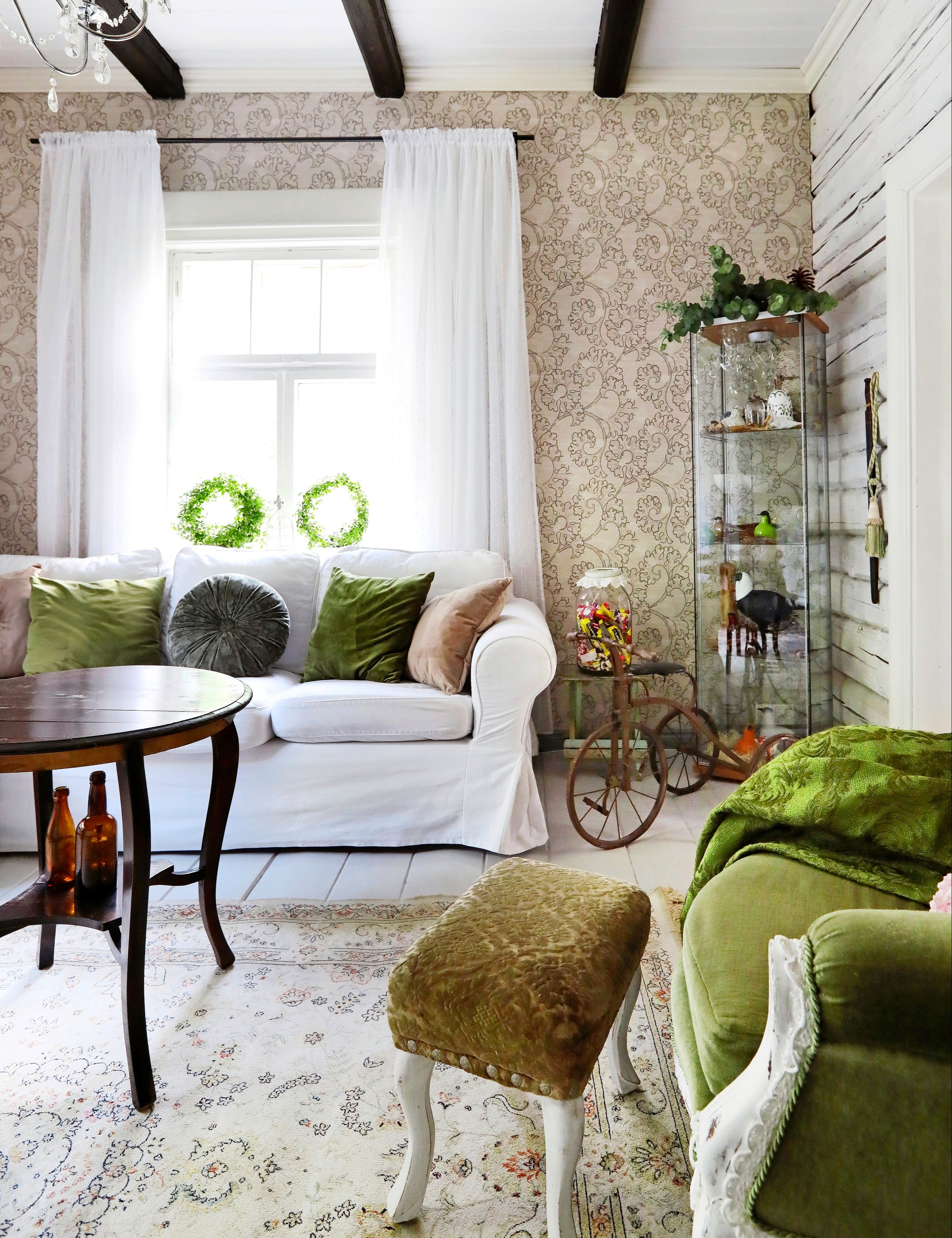 Talon alakertaa hallitsevat keittiö ja olohuone. 0liivinvihreä nojatuoli on olohuoneen väripilkku, viiden euron löytö. Anne tuunasi sitä maalilla, reunoille tuli pitsiä ja reunanauhaa. Ikean lasivitriinissä asuu Oiva Toikan lasilintuja. Puuvanteinen kolmipyörä on lahja työkaverilta.