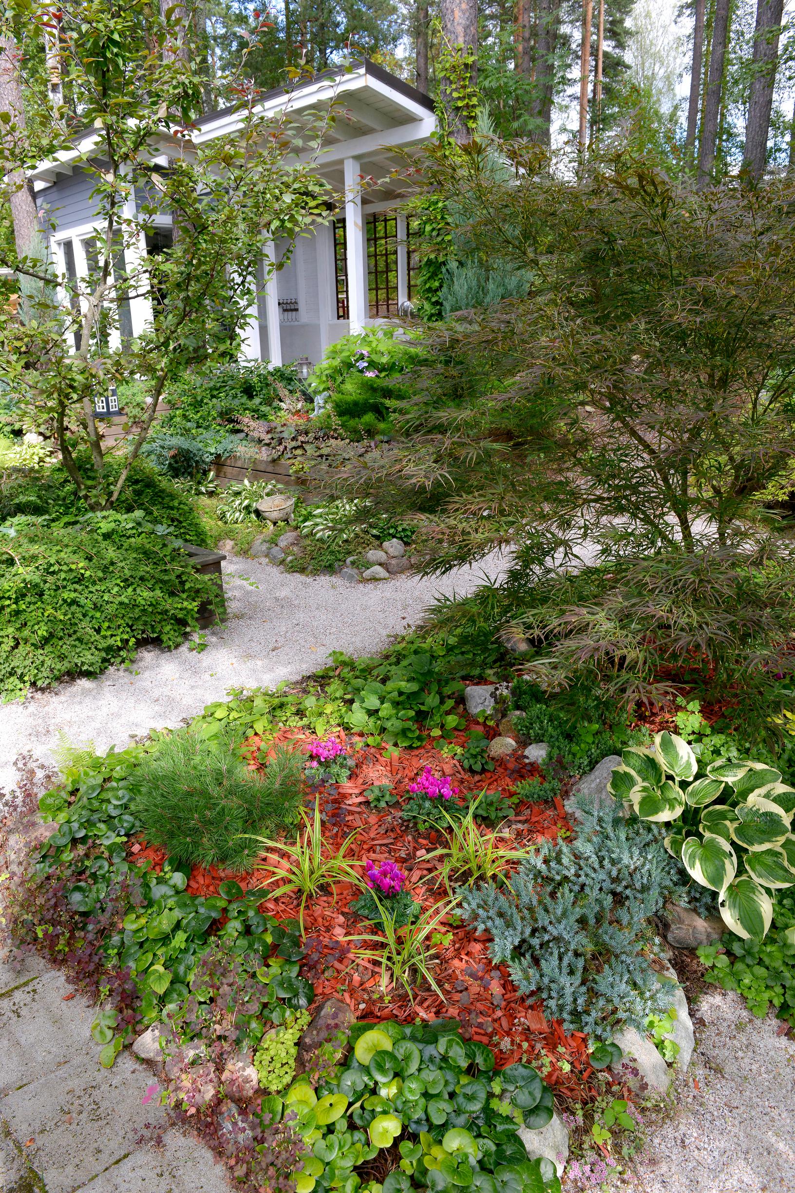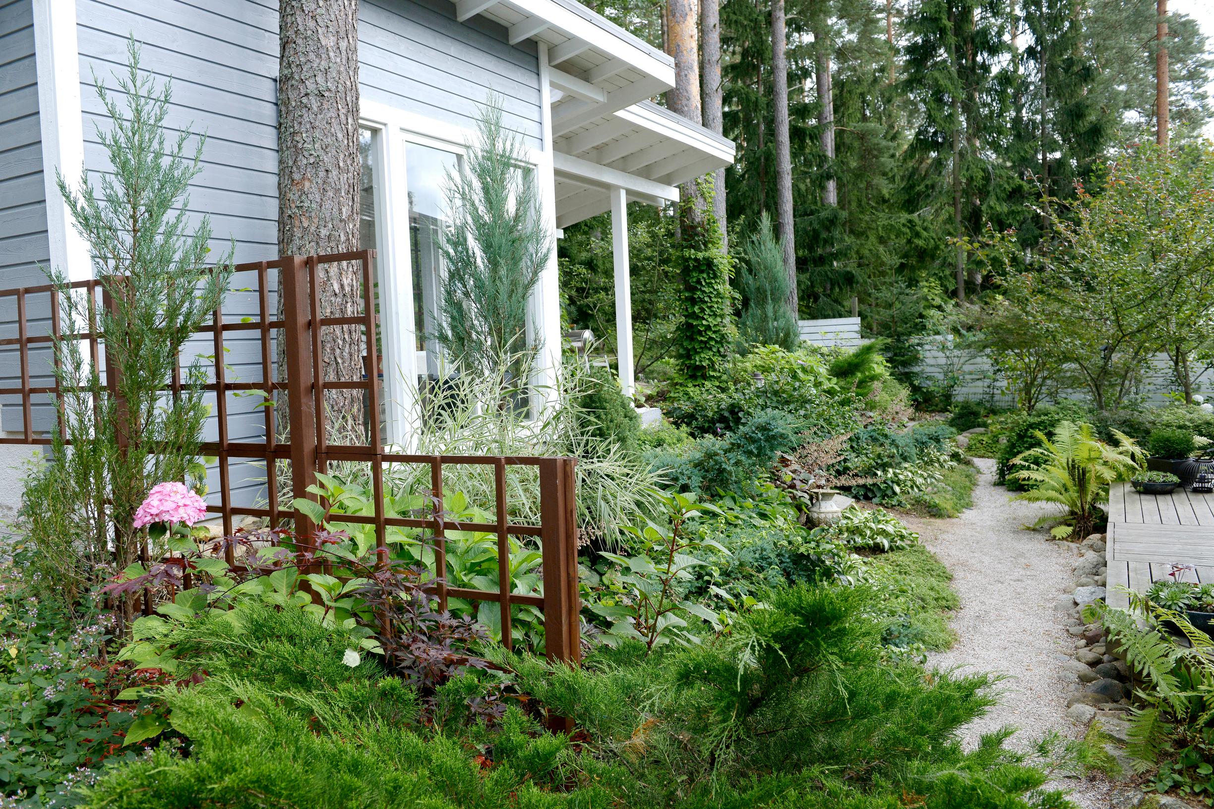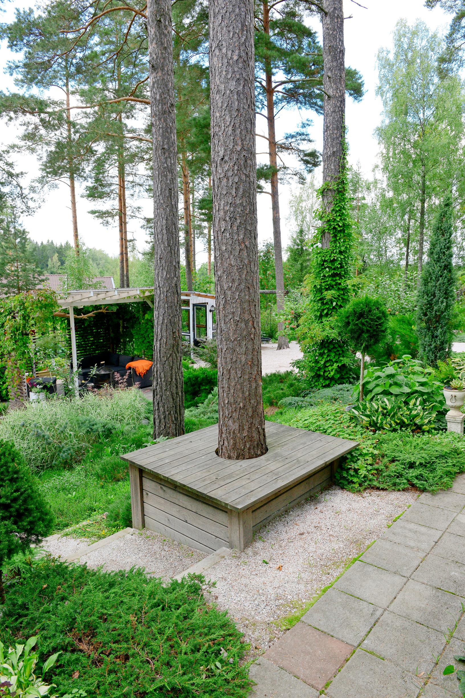 Myös itse tontilla on korkeuseroja. Erika ja Jaakko halusivat säästää olemassa olevaa männikköä mahdollisimman paljon, mutta puut eivät kestä maan täyttöä. Kuitenkin puutarha piti saada toimivaksi ja siirtymät turvallisiksi ja kulkukelpoisiksi. Ratkaisu löytyi kannellisista puulaatikoista, jotka rakennettiin puun rungon suojaksi. Näin aivan rungon tyveen ei tarvinnut kasata maata.