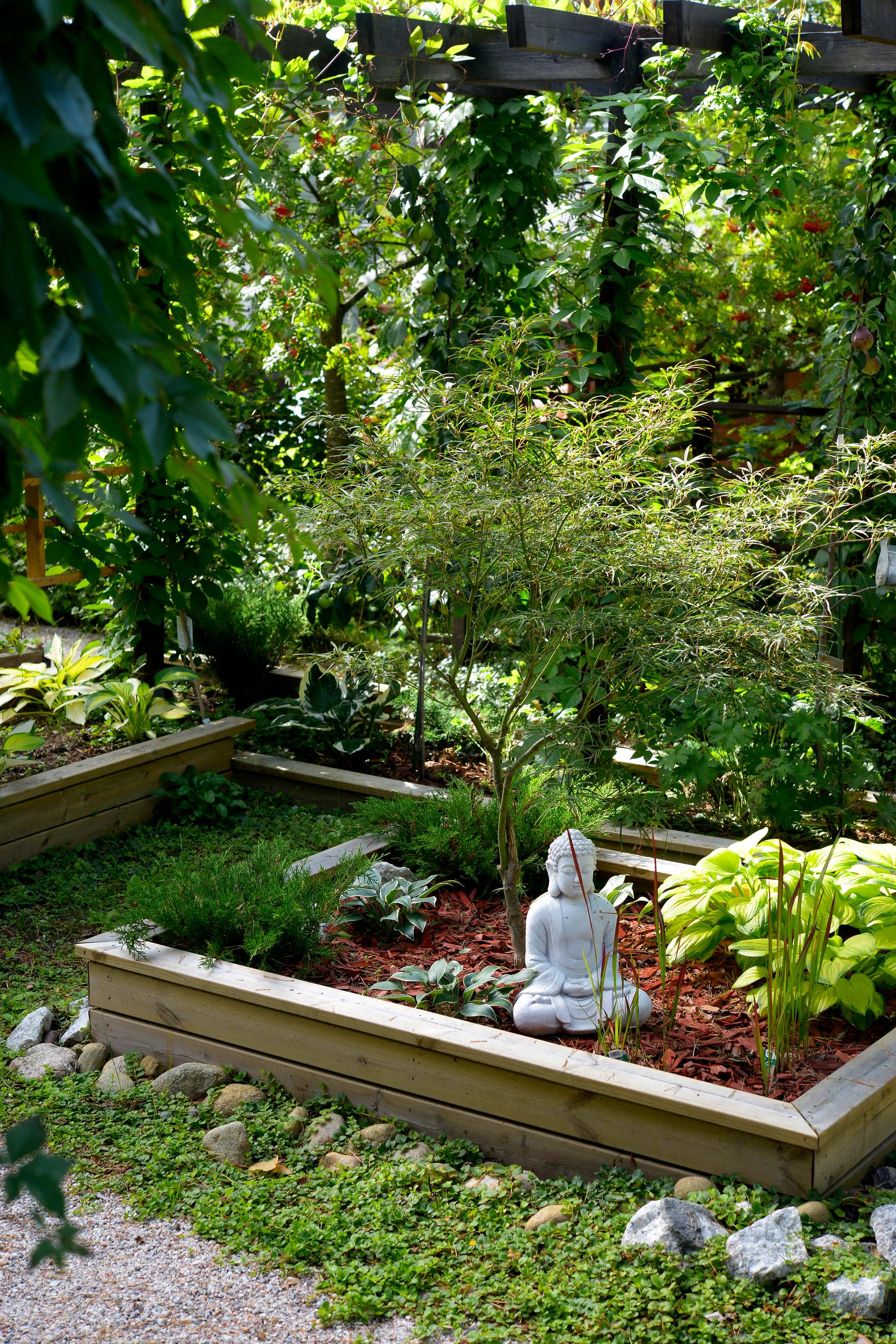 Pergola verhoutuu köynnöksiin, säleikön takaa paljastuu japaninvaahtera ja mystisesti hymyilevä patsas. Erika kutsuu puutarhaansa japanilais-roomalaiseksi.