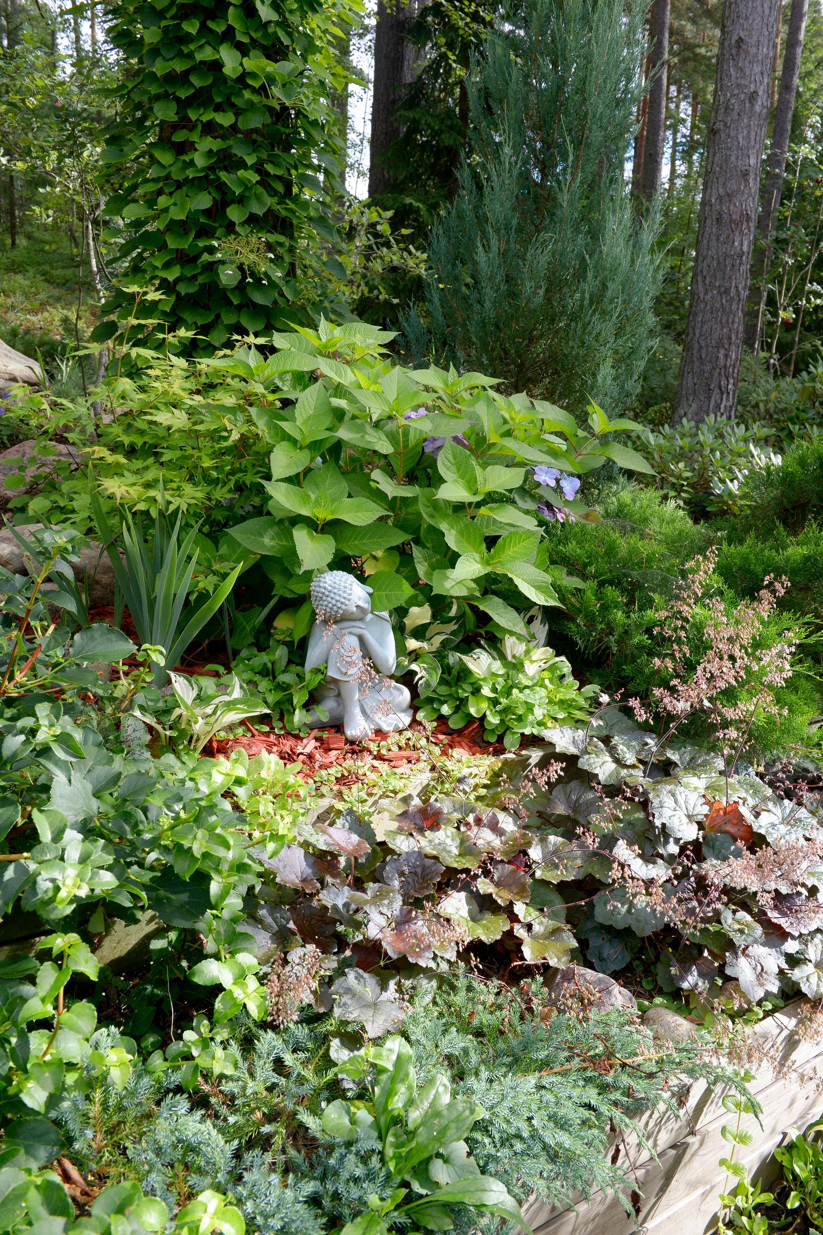 – Keväällä täällä on aika minimalistista, karuakin, kun havujen lisäksi kukkivat lähinnä sipulikasvit. Kesän edetessä puutarha rehevöityy niin, että kasveja on pakko leikata ja jakaa.