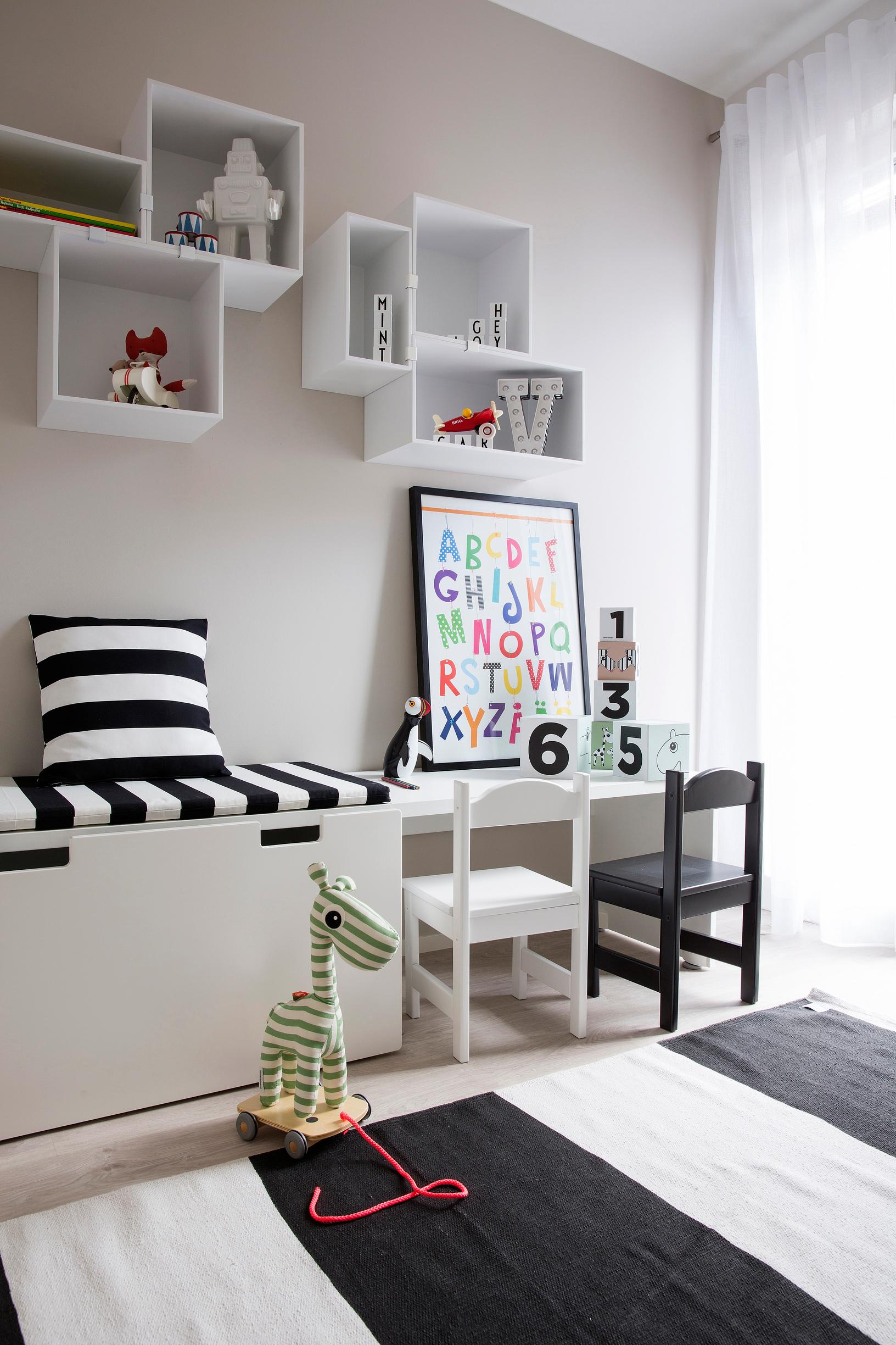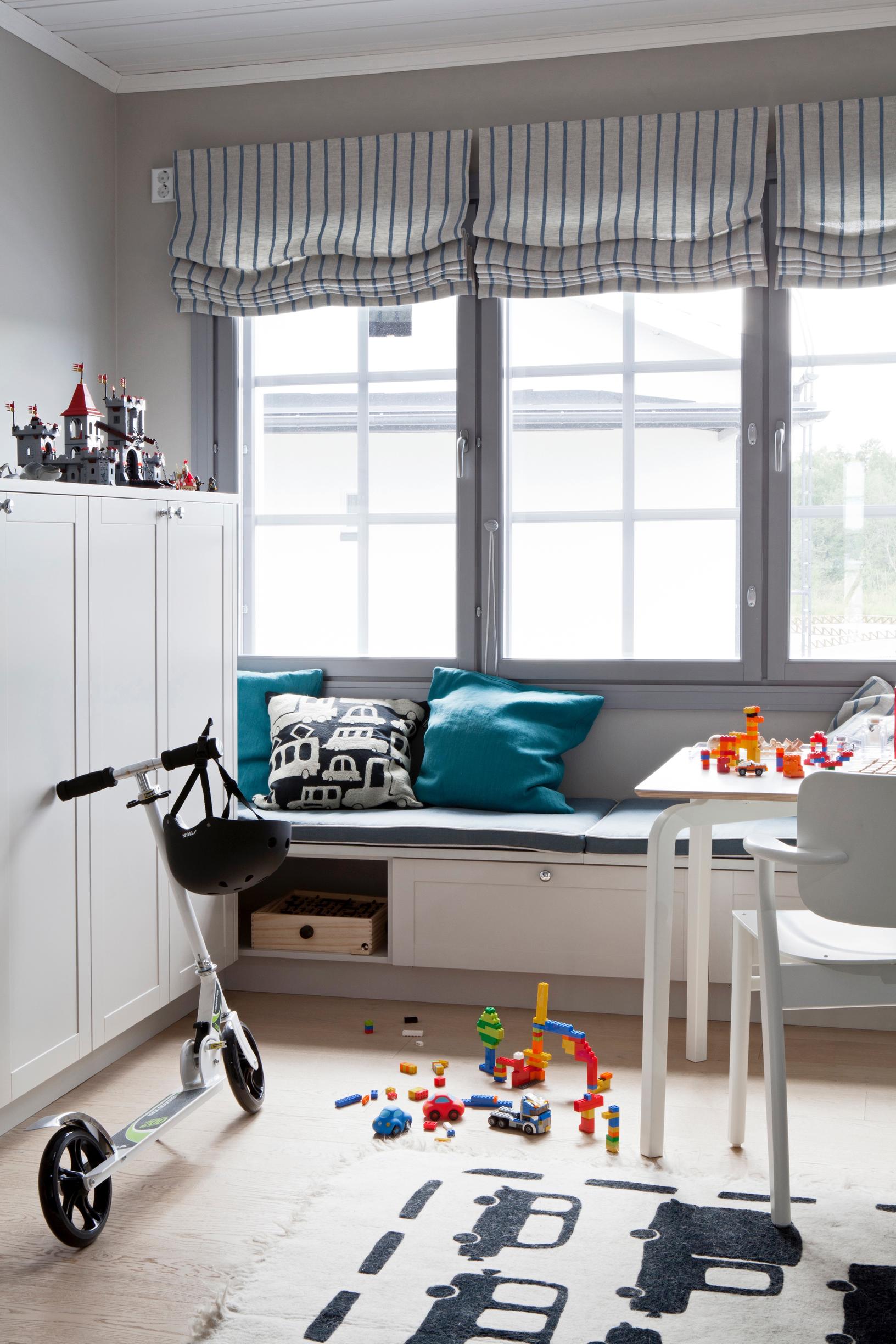 Umpinaisia kalusteita, kyllä kiitos! Lastenhuoneessa toimivat puolikorkeat kaapistot, sillä niiden päälle jää laskutilaa legorakennelmille ja tilataideteoksille – pikkusisarusten ulottumattomiin. Ikkunan edusta on mainio paikka matalalle säilytyskalusteelle, joka toimii myös penkkinä, kun siihen verhoilee määrämittaisen patjan.