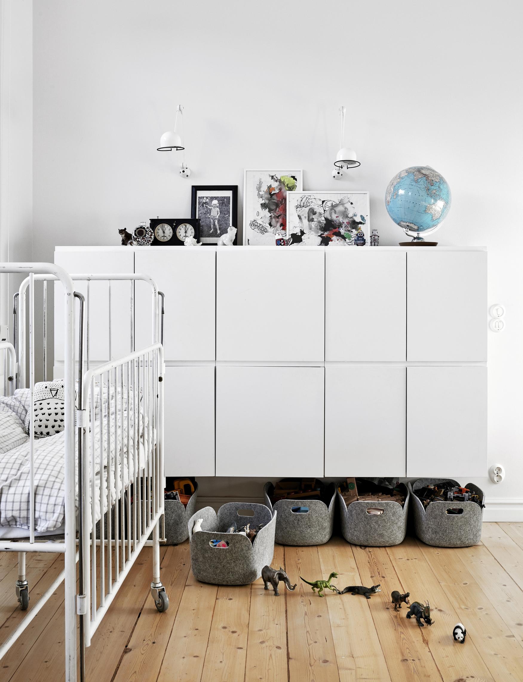 Lastenhuoneeseen on viisautta valita ajattomia, muunneltavia kalusteita. Nämä Muuramen kaapistot olivat aiemmin toisaalla matalana tasona. Alle jää siivousta helpottavaa tilaa, johon mahtuu koppia. Muuton huopakorit eivät kolise esiin liikuteltaessa, ja niihin saa ryhmiteltyä erityyppiset lelut.4. Askel askeleelta järjestykseen