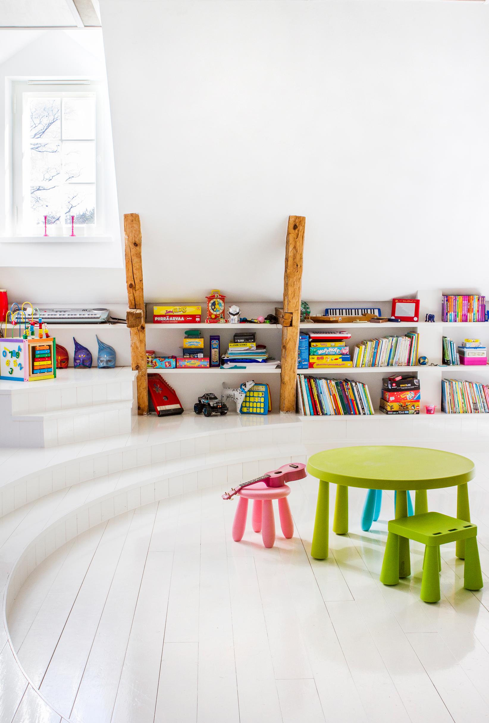 Viiston katon lappeenaluset ja muut hukkatilat voi hyödyntää nikkaroimalla tai teettämällä niihin räätälöidyt pikkuhyllyt leluille ja kirjoille. Ne ovat lapsen käyttöön juuri sopivalla korkeudella.