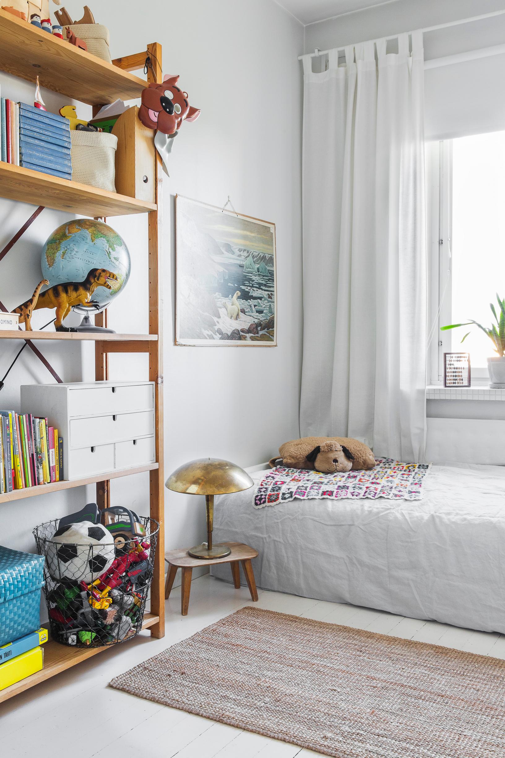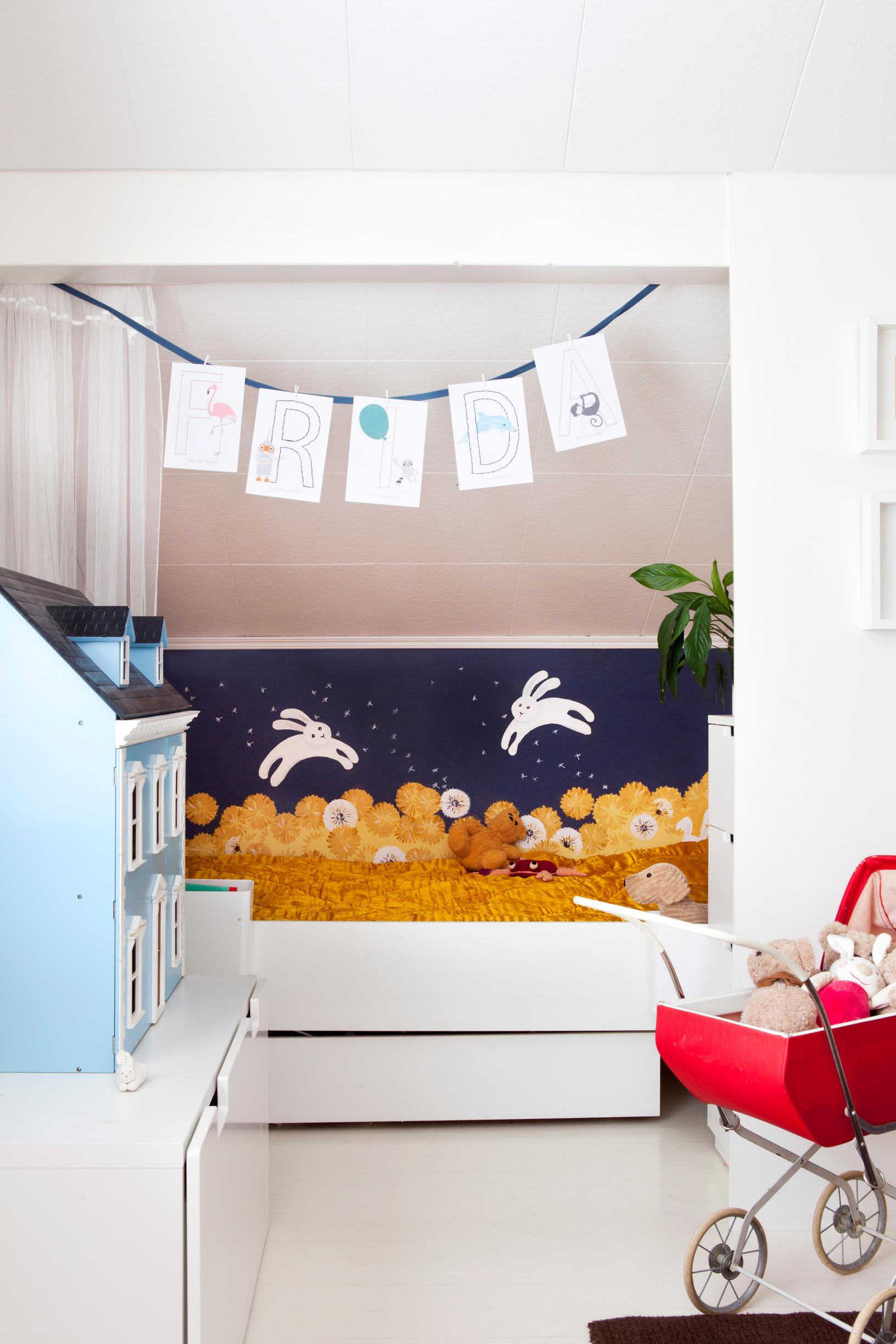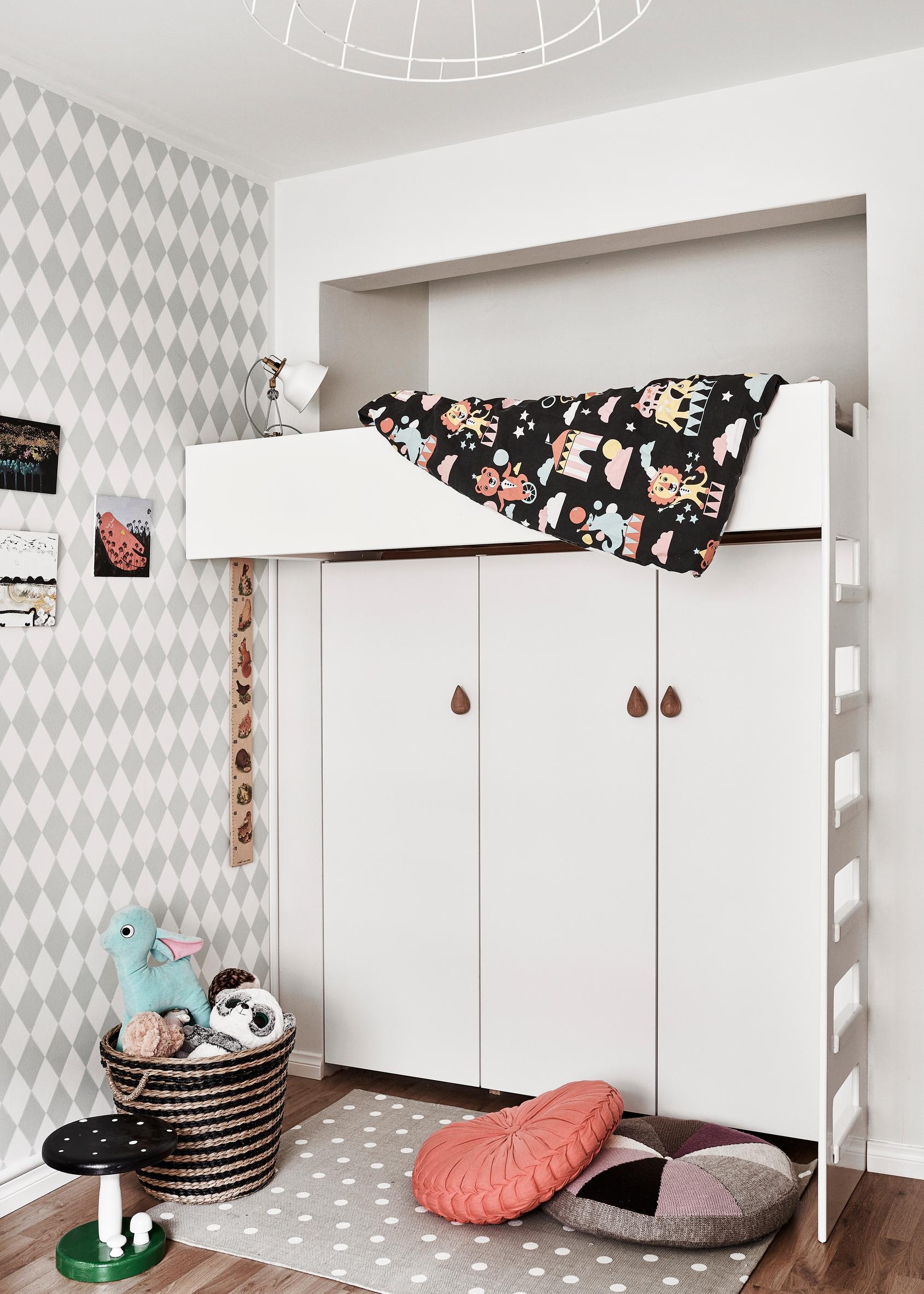 Jos huoneessa on vuoteelle riittävän leveä syvennys, harkitse sen hyödyntämistä parvena. Sänkyosan alle jää tilaa puolikorkealle, tilavalle kaapistolle. Ja niille kymmenille pehmoleluille toimiva paikka on kookas lattiakori.