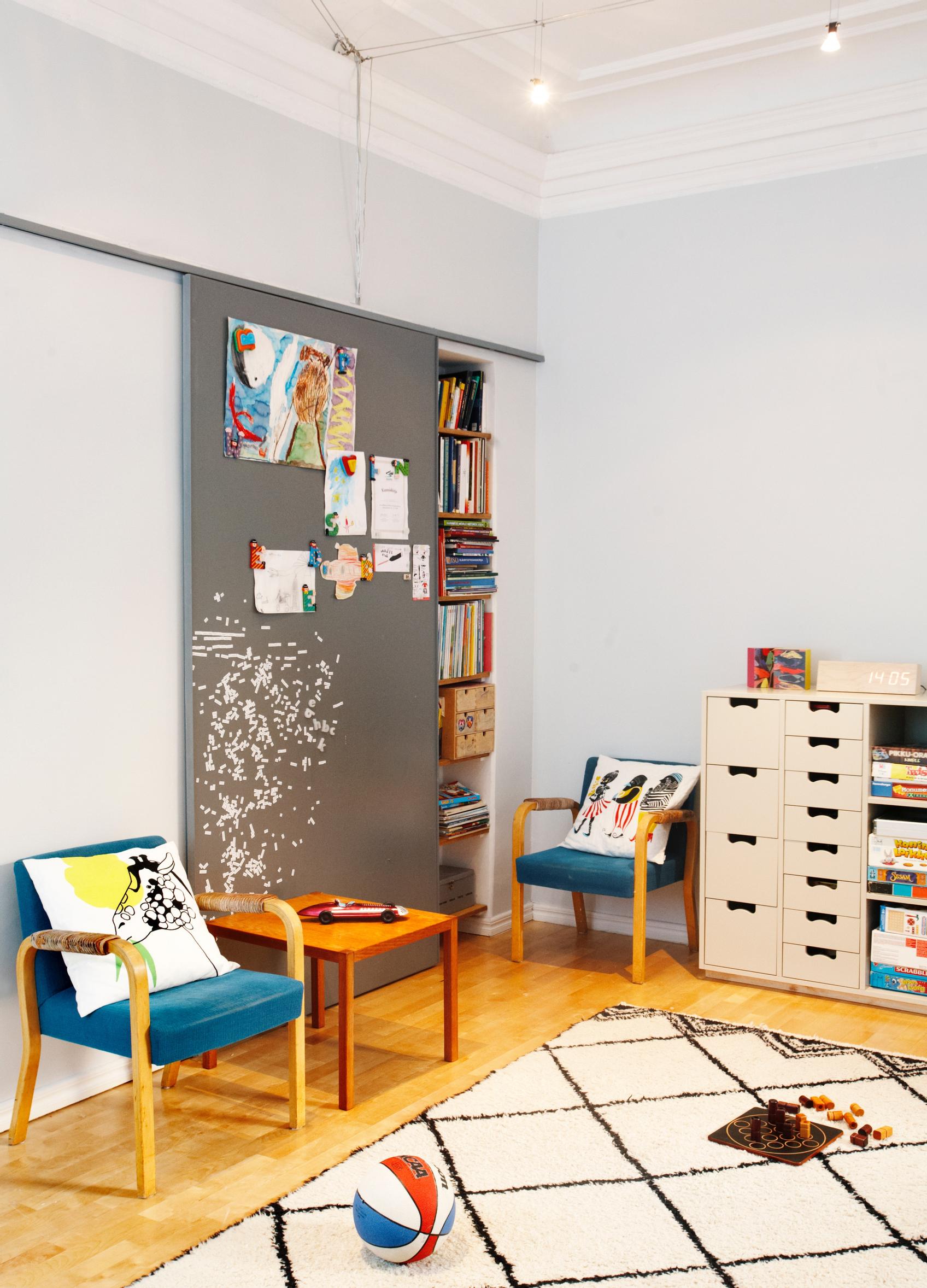 Lastenhuoneeseen on viisautta valita ajattomia, muunneltavia kalusteita. Nämä Muuramen kaapistot olivat aiemmin toisaalla matalana tasona. Alle jää siivousta helpottavaa tilaa, johon mahtuu koppia. Muuton huopakorit eivät kolise esiin liikuteltaessa, ja niihin saa ryhmiteltyä erityyppiset lelut.