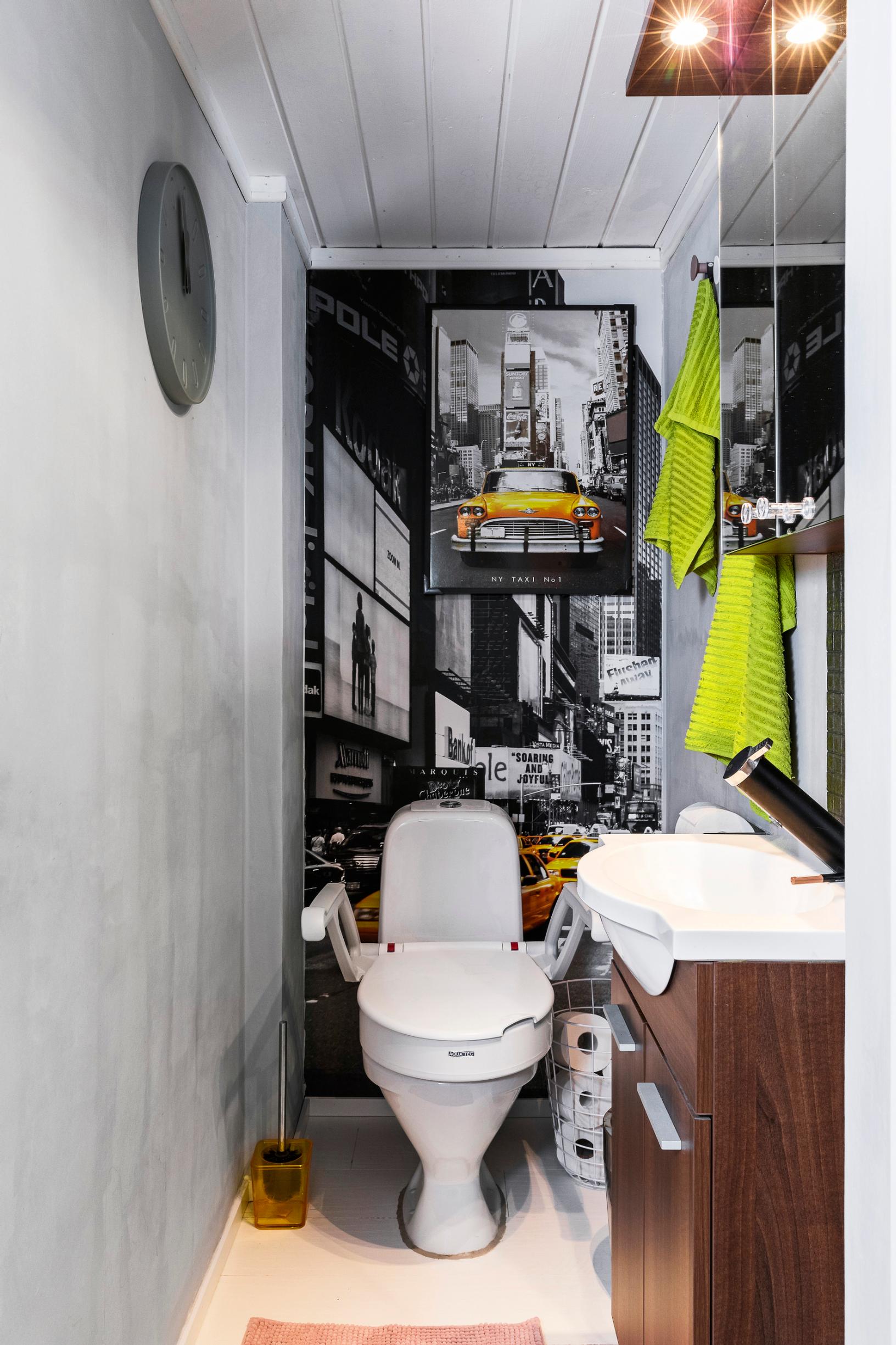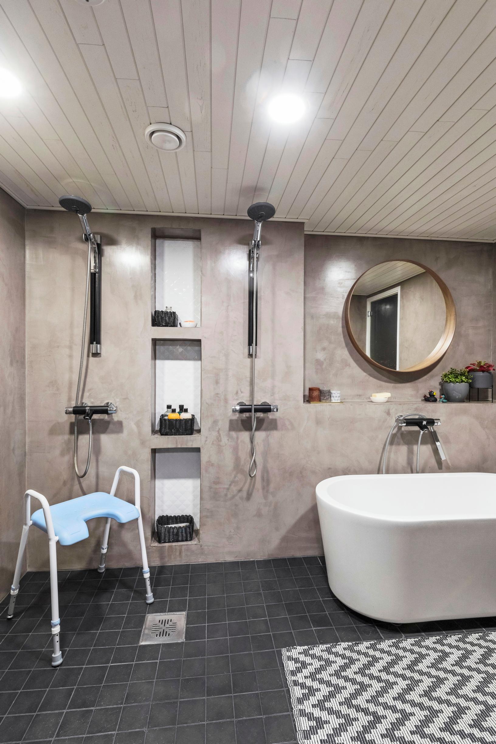 Alakerran toimivuutta lisättiin vaihtamalla kodinhoito- ja makuuhuoneiden hankalat ovet helposti avattaviin liukuoviin. Niitä Suvi toivoisi kotiin lisää. Kylpyhuone oli perusteellisen remontin jäljiltä jo valmiiksi esteetön, joten se ei vaatinut muutoksia. Rollaattoria varten on halkaisijaltaan 1,5 metrin kääntymisympyrä. Kylpyhuoneen vieressä olevan saunan toimivuutta sen sijaan parannettiin pienillä muutoksilla. Löylyhuoneen lauteisiin tehtiin sisennetty tila pyörätuolille ja kiuasseinälle asennettiin käsijohde.