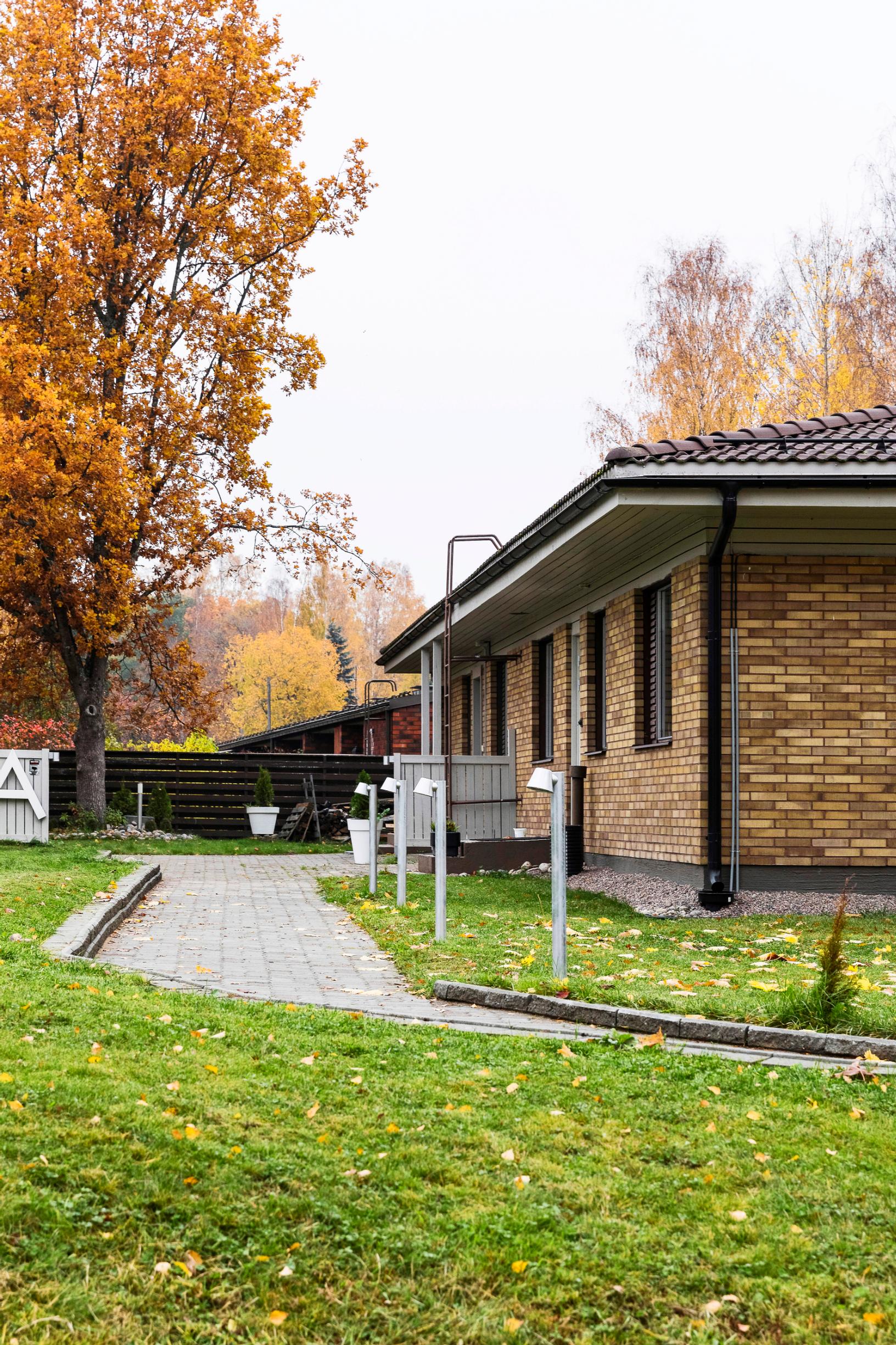 Muutostyöt jatkuivat sisäremontin jälkeen ulkona, jolloin talon kulkuväylät levennettiin apuvälineitä käyttävälle riittäviksi. Myös rinteen ja pääoven portaat madallettiin loiviksi siten, että niiden laitaan saatiin luiskat. Porrasaskelmat mitoitettiin helppokulkuisiksi Invaliidiliiton laskentakaavaa mukaillen. Piharemontti toteutettiin pääosin talkoovoimin. Esimerkiksi pihan upeat portaat nikkaroitiin lähisukulaisten ja naapurien avustuksella.