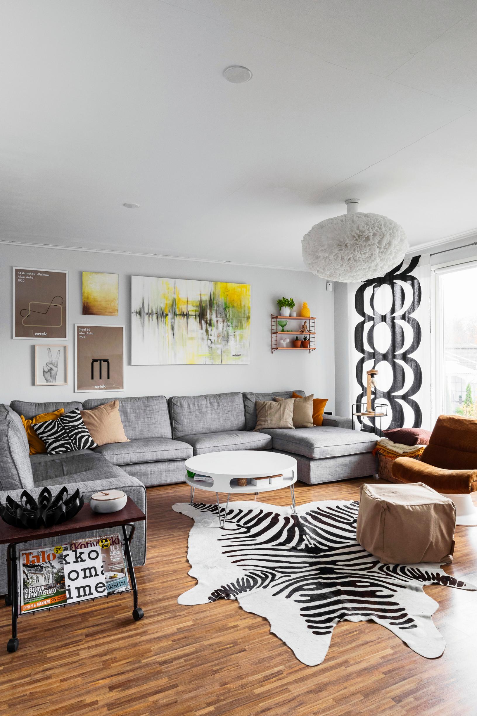 Huonekalut järjesteltiin niin, että kulkureiteistä tuli leveitä ja toimivia. Pitkänukkaiset matot vaihdettiin mataliin, jotka voi hetkessä kääräistä rullalle. Arki on nyt mahdollisimman joustavaa.