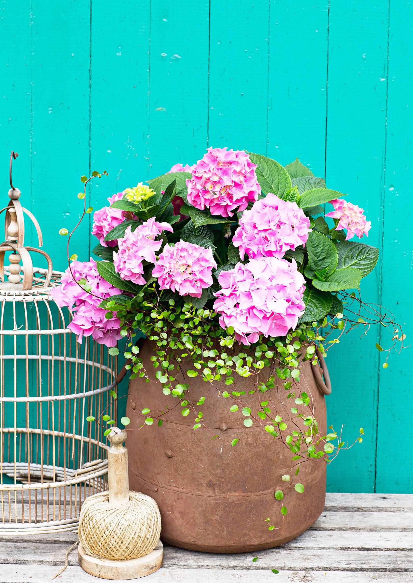 Tässä vaaleanpunaisen lajikkeen pariksi on istutettu lankaköynnöstä, jonka ohuet punertavat varret sointuvat hortensian kukkien väriin etenkin loppukesästä. Ruostunut vanha astia korostaa hortensian kukkien ja vihreiden lehtien komeutta, ja lankaköynnös keventää sopivasti muhkeaa kokonaisuutta.