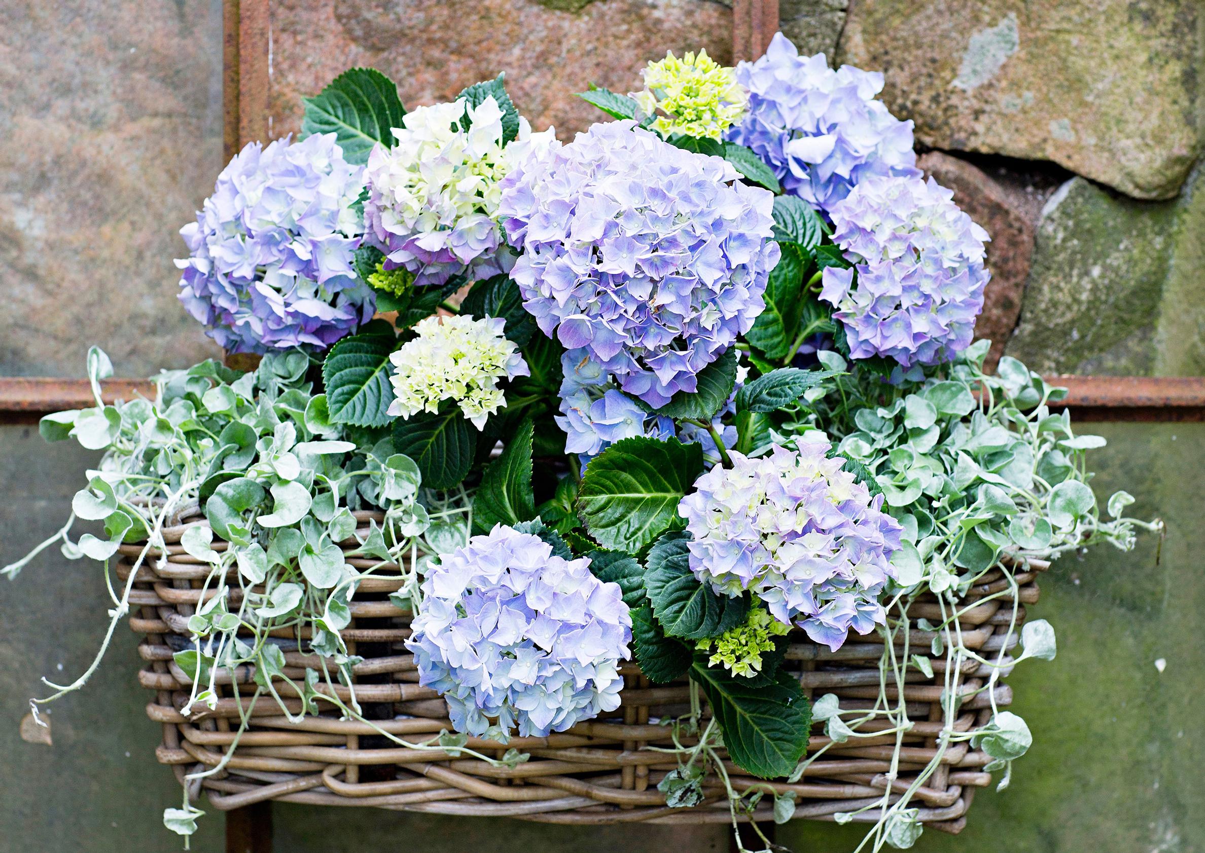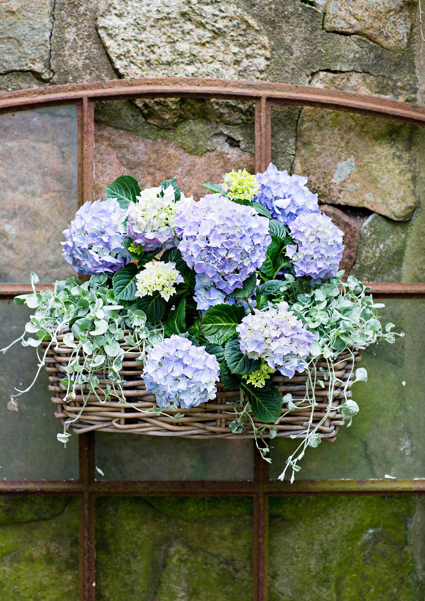 Hortensia sopii tyyliltään romanttiseen pajusta punottuun parvekelaatikkoon. Ripusta se seinustalle tai parvekkeen kaiteelle. Vältä tuulista paikkaa, sillä painavat kukkatertut saattavat heilua niin paljon, että varret katkeavat helposti.