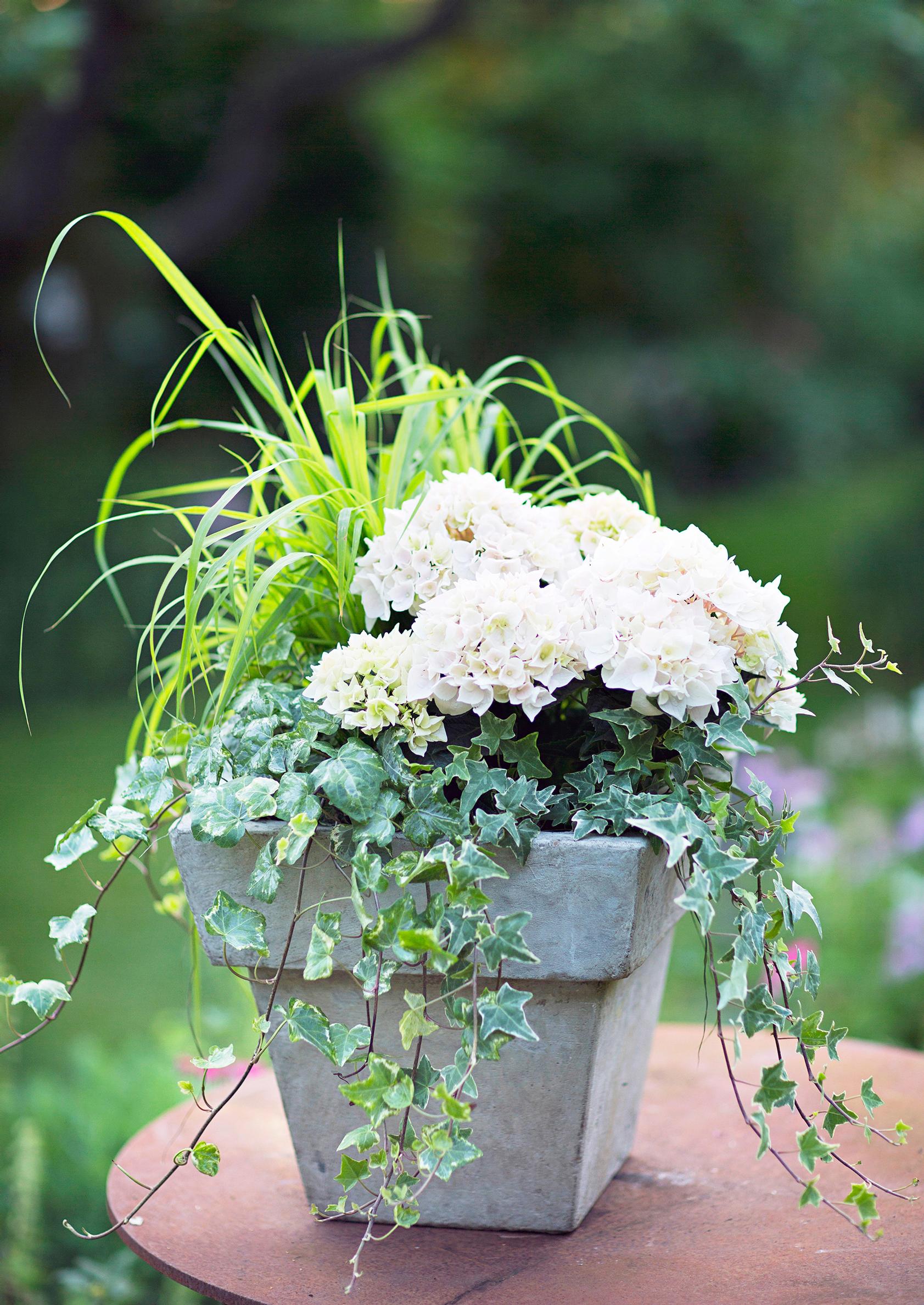 Näyttävä ja tasapainoinen ruukkuasetelma syntyy kolmella kasvilla: sivuille ja ylöspäin kurottavalla raikkaanvihreällä elefanttiheinällä, riippuvalla kirjavalehtisellä muratilla ja ryhmän vetonaulalla, hämärässäkin hehkuvalla valkokukkaisella hortensialla.