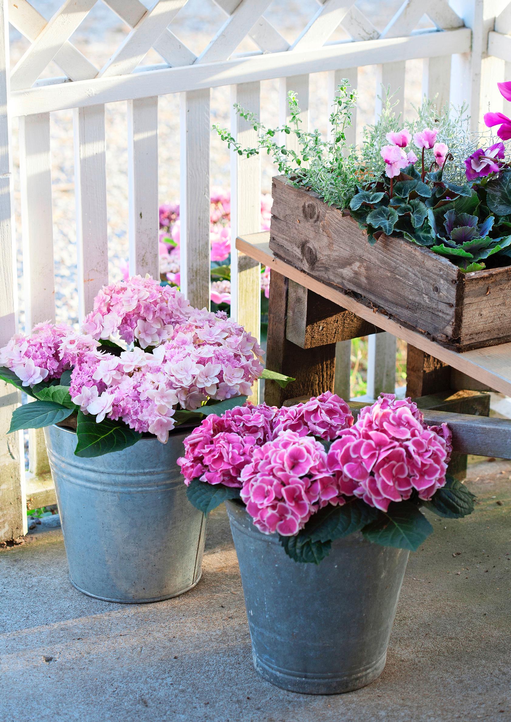Hortensioiden kukkapompulat tuovat puolivarjoisalle terassille tai parvekkeelle etelän hehkua. Pitkään kukkivat 'Magical Four Seasons' -lajikkeet ovat takuuvarmoja katseenvangitsijoita, sillä ne vaihtavat väriä jopa kolmasti kesässä. Vaaleanpunainen hortensia muuttuu kesän mittaan tummanpunaiseksi.