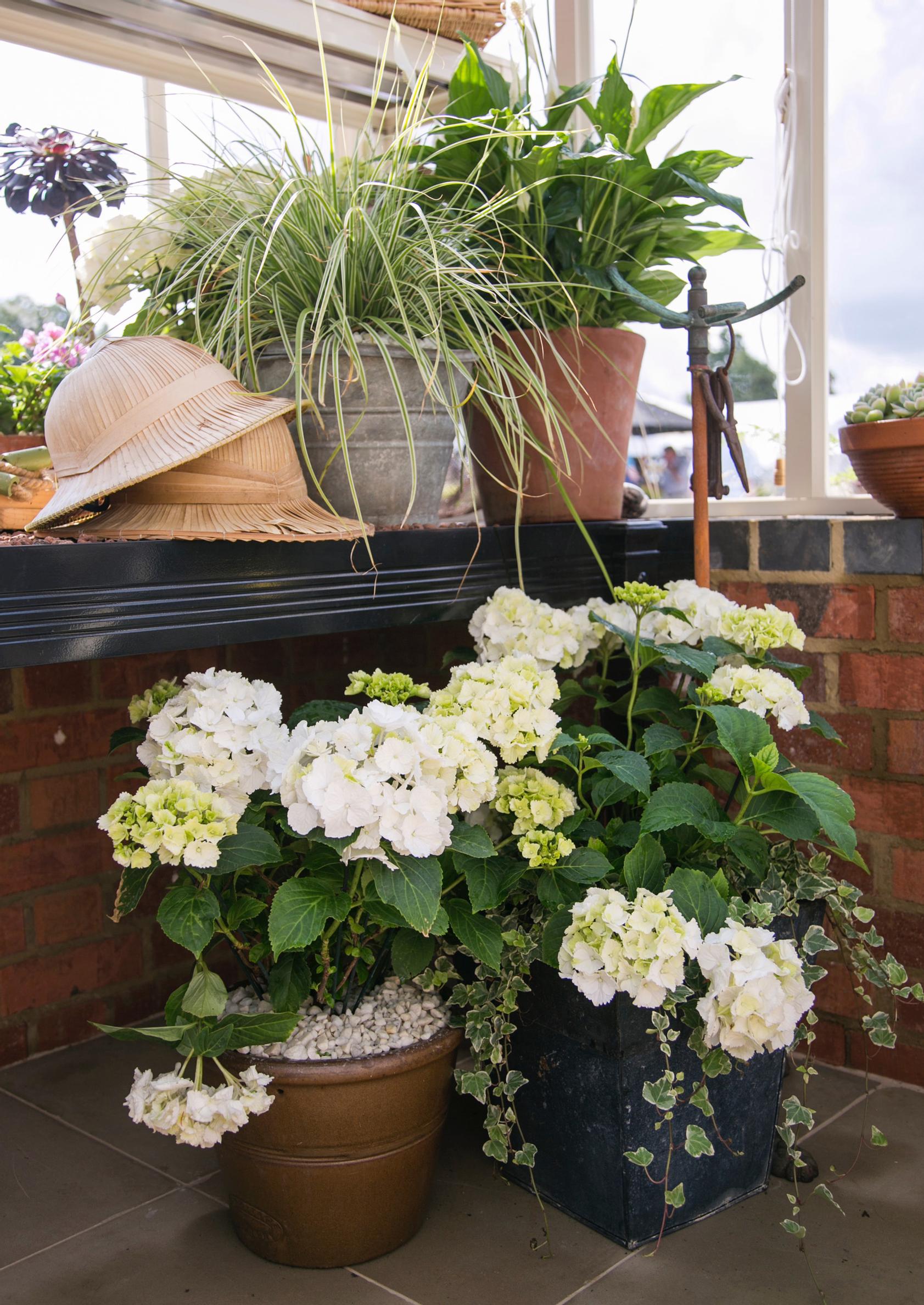 Jos hortensia on yksin ruukussa, levitä mullan pinnalle koristesoraa, joka huolittelee kokonaisuuden. Tässä ryhmässä ruukkujen sävyiksi on valittu maanläheisiä rauhallisia sävyjä, jotka tuovat kasvit hienosti esiin. Hulluttele somisteilla ja luo kokonaisuuteen oma eksoottinen loppusilauksesi. Viidakkohatut sopivat tähän kuin nenä päähän!