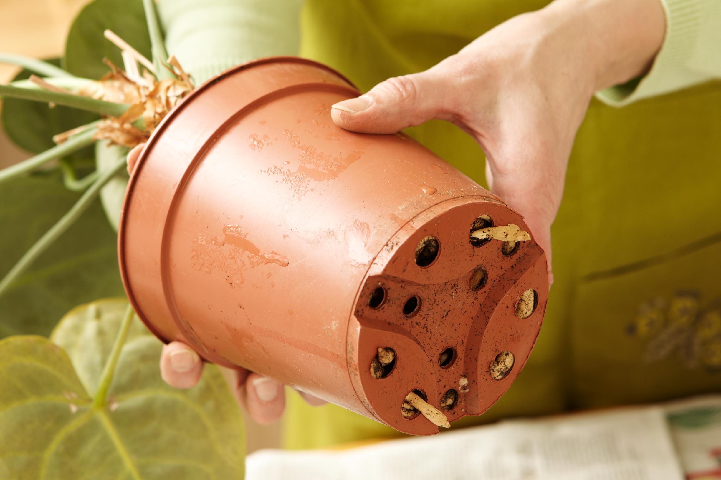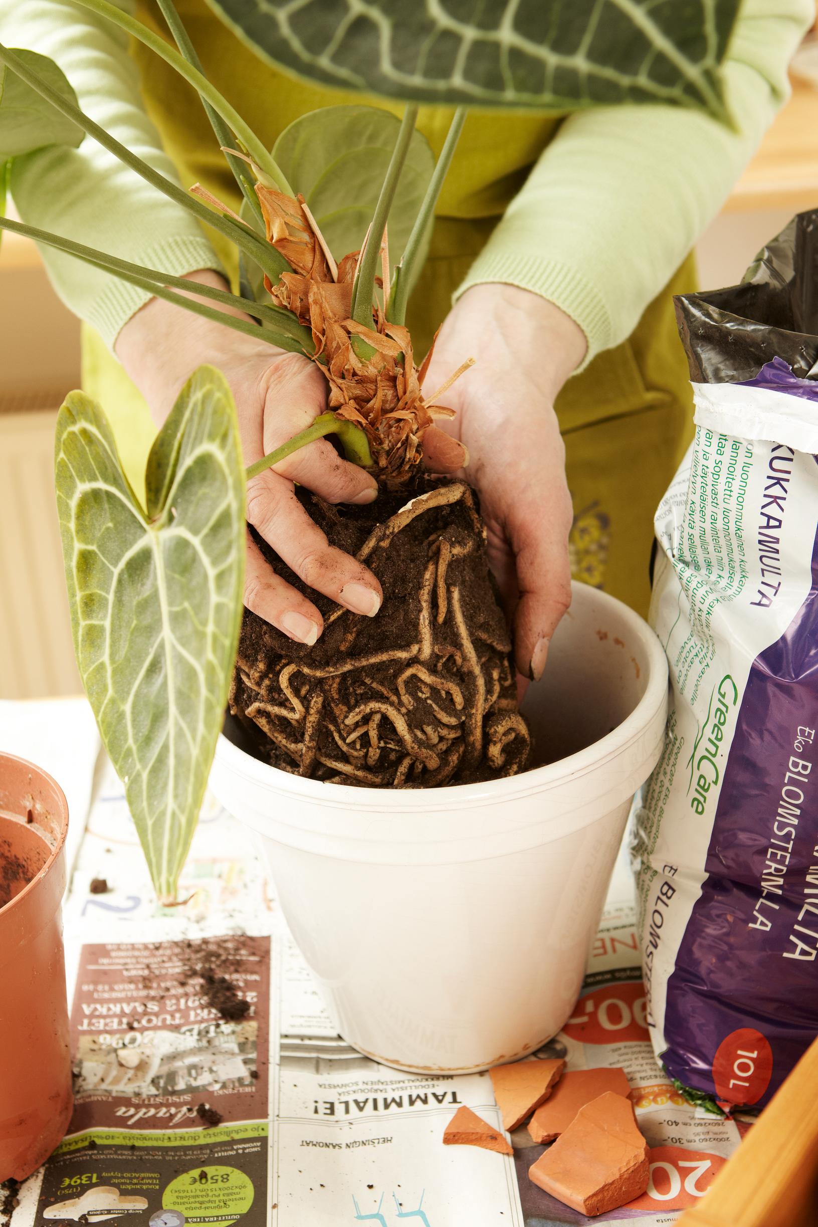 1. Kun ruukun pohjasta alkaa pilkistää yksittäisiä juurenpätkiä ja multapaakku on täyttynyt juurista, on aika siirtää kasvi isompaan ruukkuun. Kastele multapaakku, jotta se irtoaa ruukusta juuria vahingoittamatta.