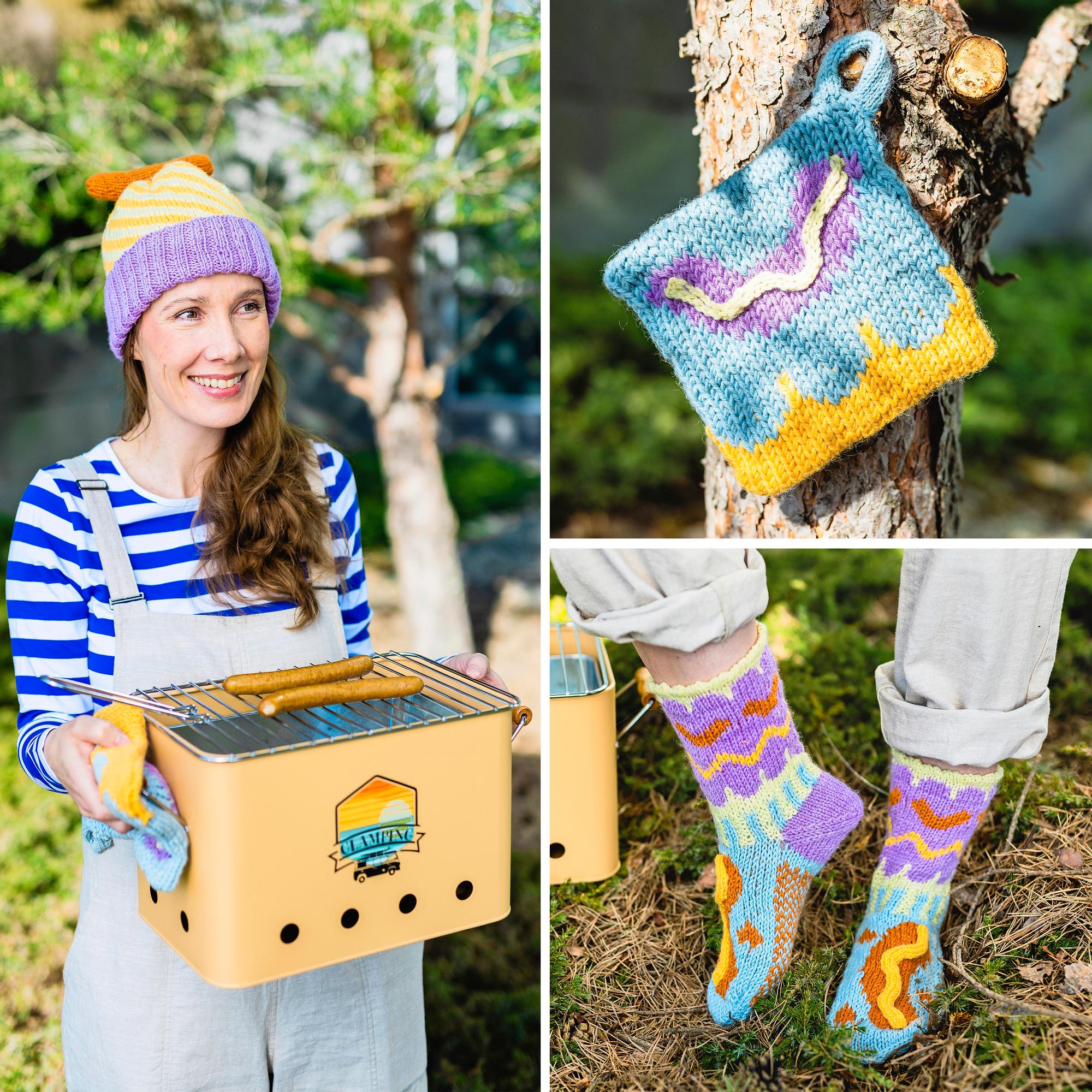 Ny rillataan! Nappaa puikoille himogrillaajan hauska neulesetti – katso ohjeet pipoon, sukkiin ja patalappuun