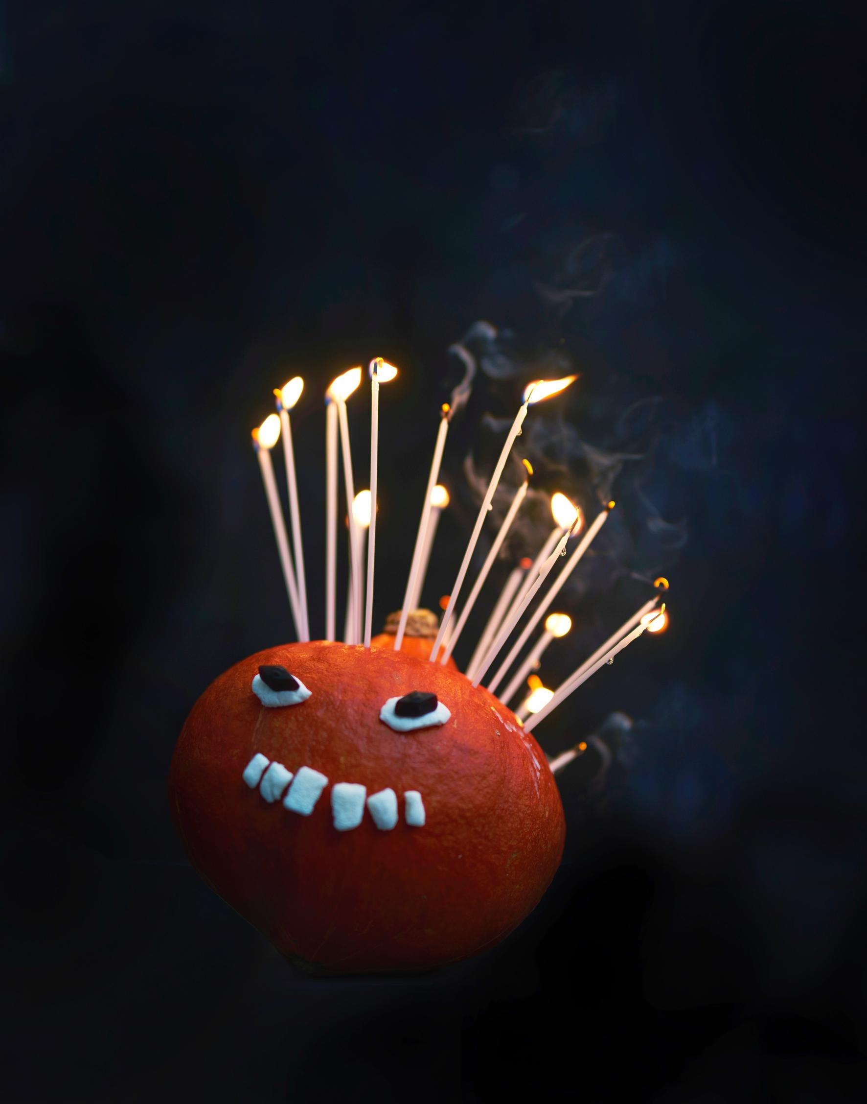 - Rei’itä varrastikulla kurpitsan päähän paikat kakkukynttilöille, pistä kynttilät reikiin ja sytytä. Voit myös tökätä kurpitsajulmurin päähän tähtisadetikkuja ja kantaa palavan pään pöytään, kun juhlijat ovat istahtaneet paikoilleen.