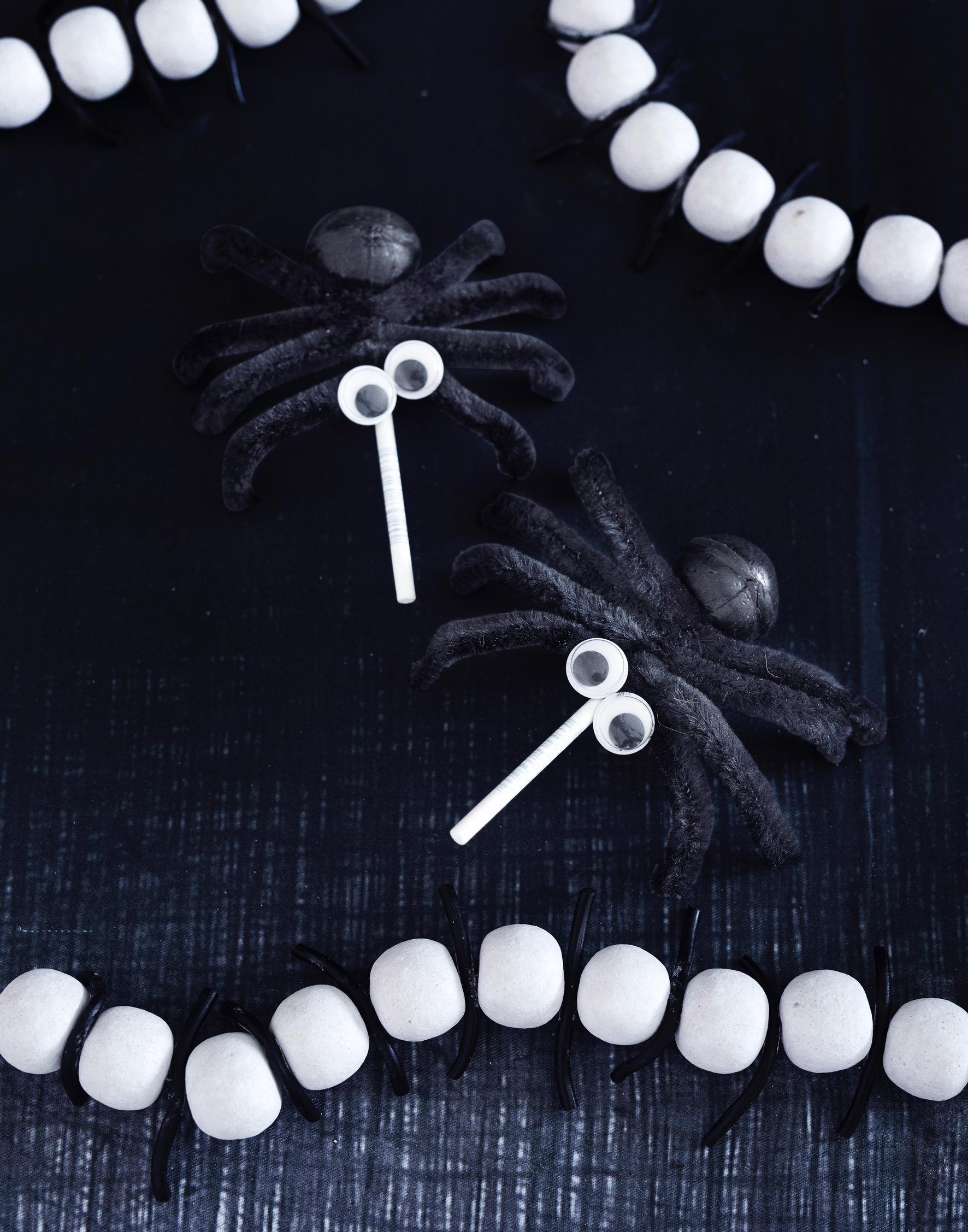 - Kieputa jokainen jalkapari keskikohdastaan tikkarin tikun ympärille, karkin juureen. Taivuta jalat kaareviksi siten, että hämähäkki pysyy pystyssä.