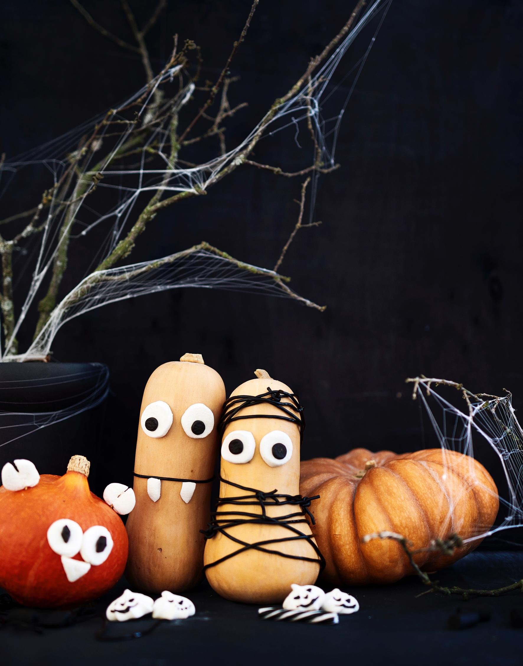 - Voit koristella kurpitsojen sijaan hedelmiä. Tee jokaiselle juhlijalle vaikka oma muumiopäärynä, pöllöomena tai vampyyribanaani.