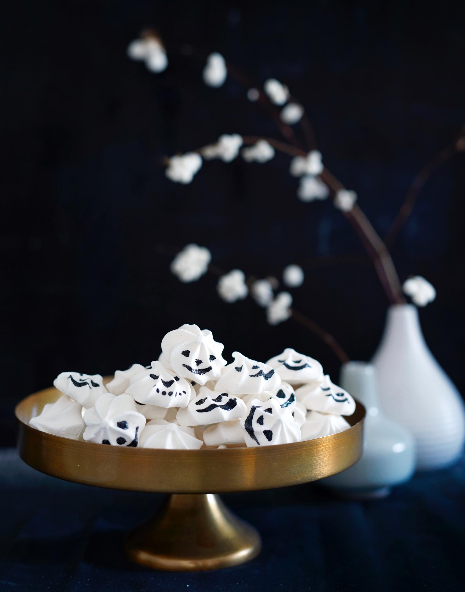 - Maalaa valmismarengeille naamat. Homma onnistuu, kun hankit mustan pastavärin leivontatarvikekaupasta. Käytä puhdasta ja kapeaa sivellintä.
