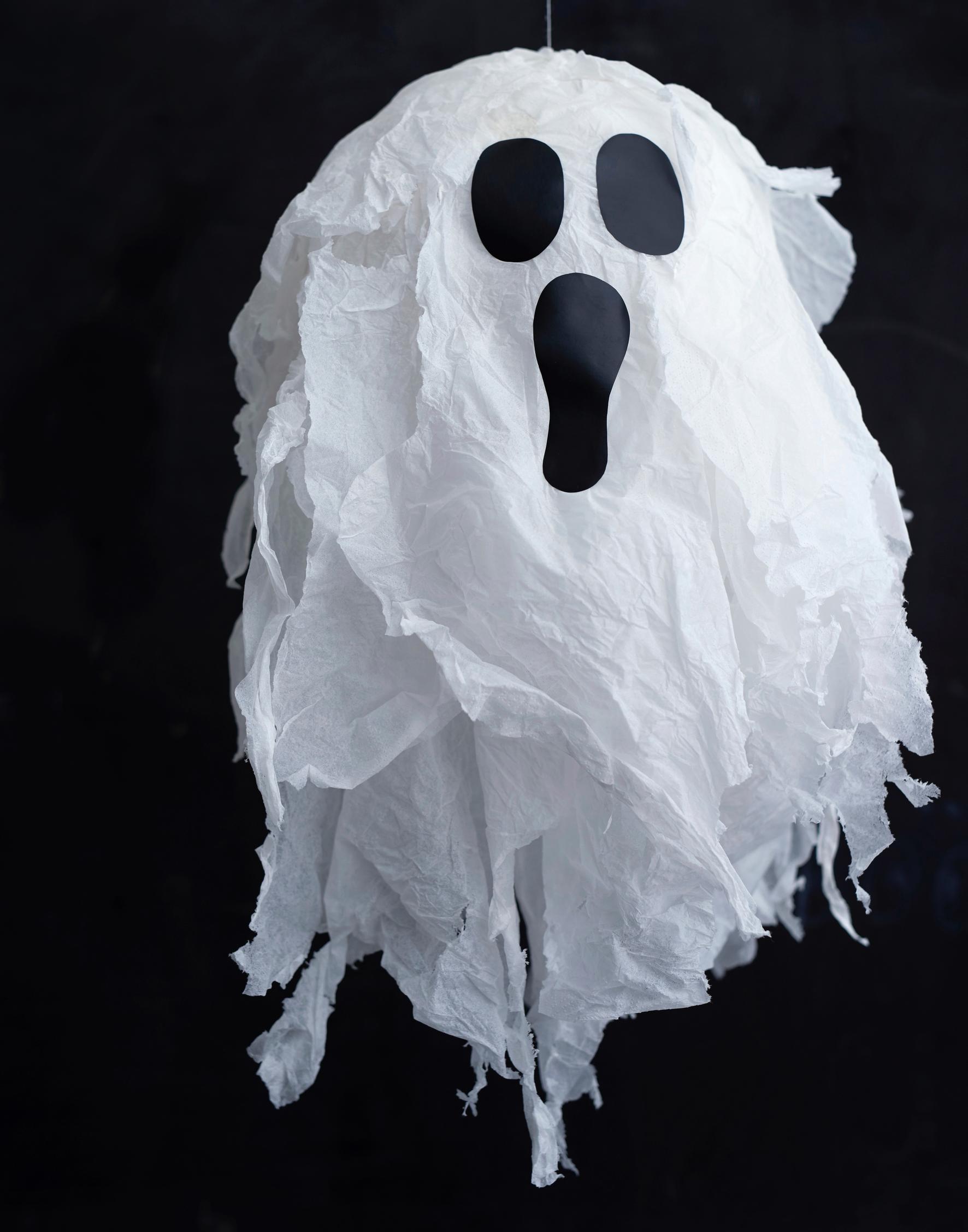 - Revi paperiserviettien reunat rispaantuneiksi. Liimaa serviettejä vain yhdestä kulmastaan pallon päälle lomittain roikkumaan. Aloita papereiden liimaaminen haamun alavatsan kohdalta ja etene kerroksittain kohti päälakea.
