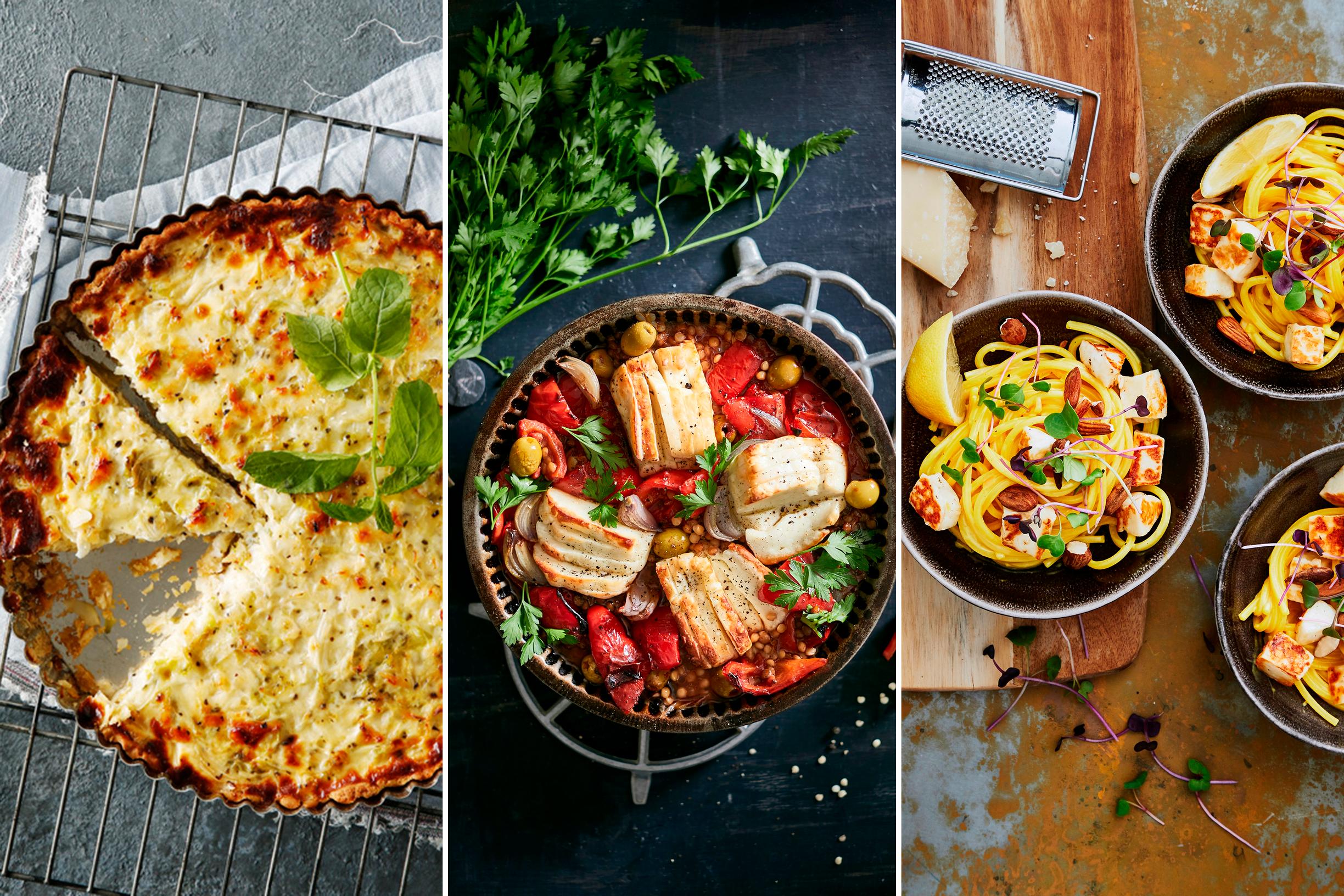 Valitsimme kolme erinomaista reseptiä suolaisesta suosikkijuustosta. Hauduta halloumia tomaattisessa linssipaistoksessa, leivo juustoinen kaalipiirakka tai pyöräytä halloumin kaveriksi kullankeltainen pasta.