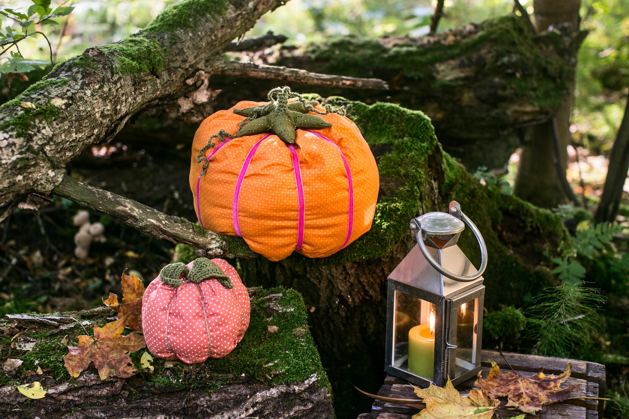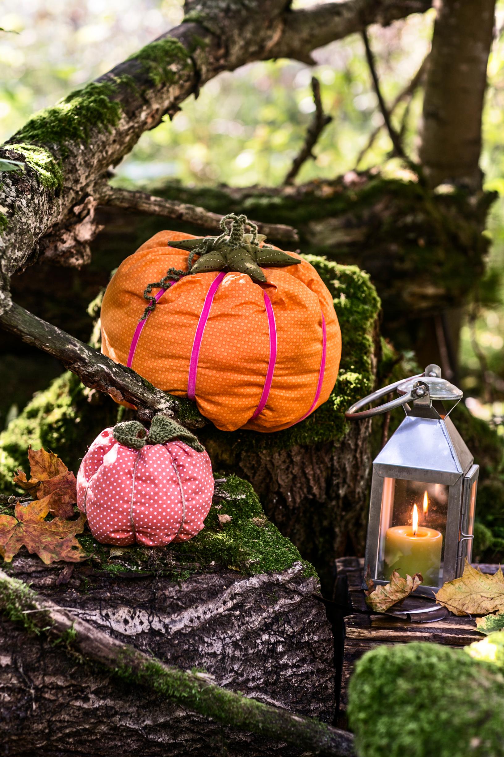 Kurpitsakoristelu ei vaadi enää kaiverrusta ja veitsen käyttöä. Ompele muhkeita kurpitsoja oransseista kankaista, ja sijoittele niitä vaikka ovensuuhun ja portille. Yhden voi toki varata sohvatyynyksi!