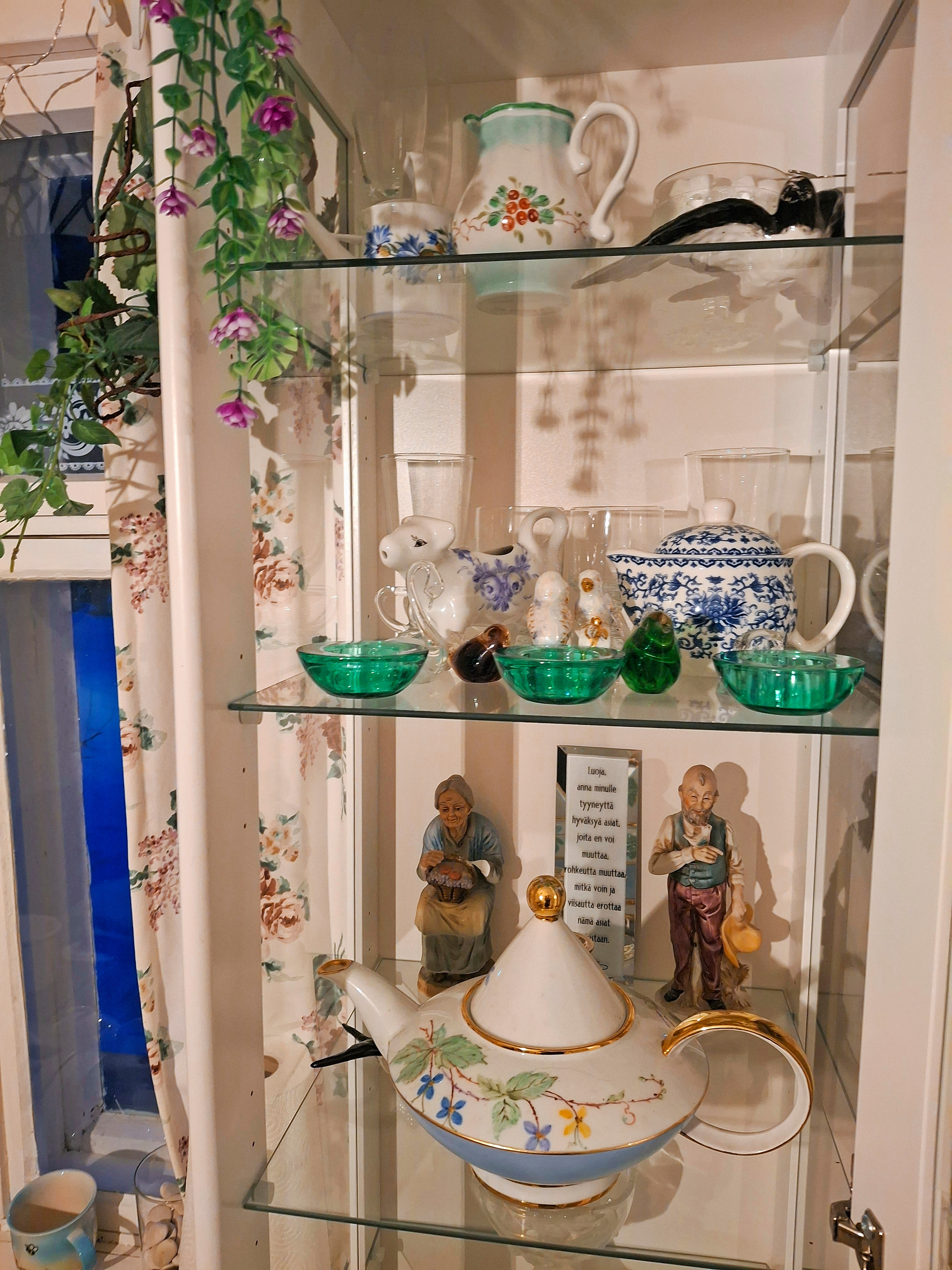 – Perheemme oli hyvin köyhä, varaa ylimääräiseen ei ollut. Yritin kovasti siivota ja laittaa kotia kauniiksi jo lapsena, mutta meillä ei juuri ollut kauniita esineitä. Nyt tavallaan paikkaan tuota puutetta.