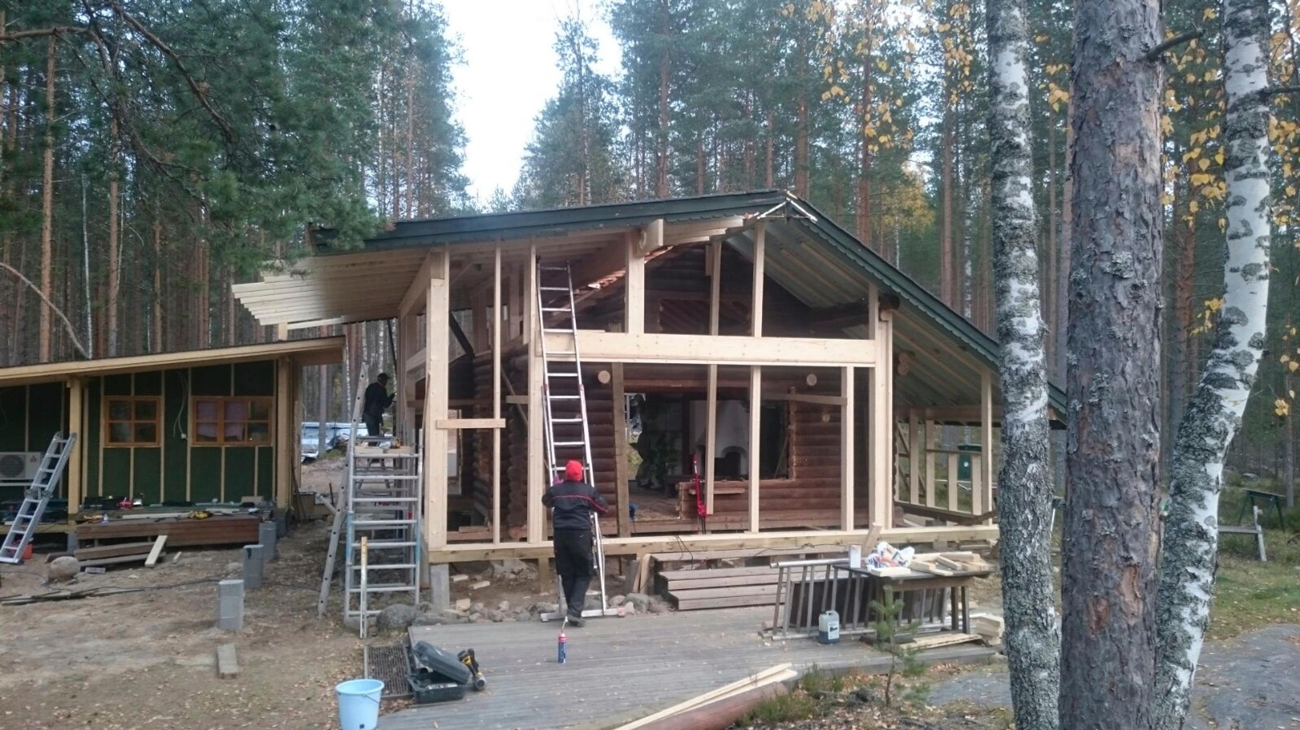Koska mökin laajennus oli poikkeuksellinen, työjärjestys, tuennat ja hirsirakenteen painumisen hallinta uuden ja vanhan rungon liittymiskohdissa vaativat erityistä huomiota.