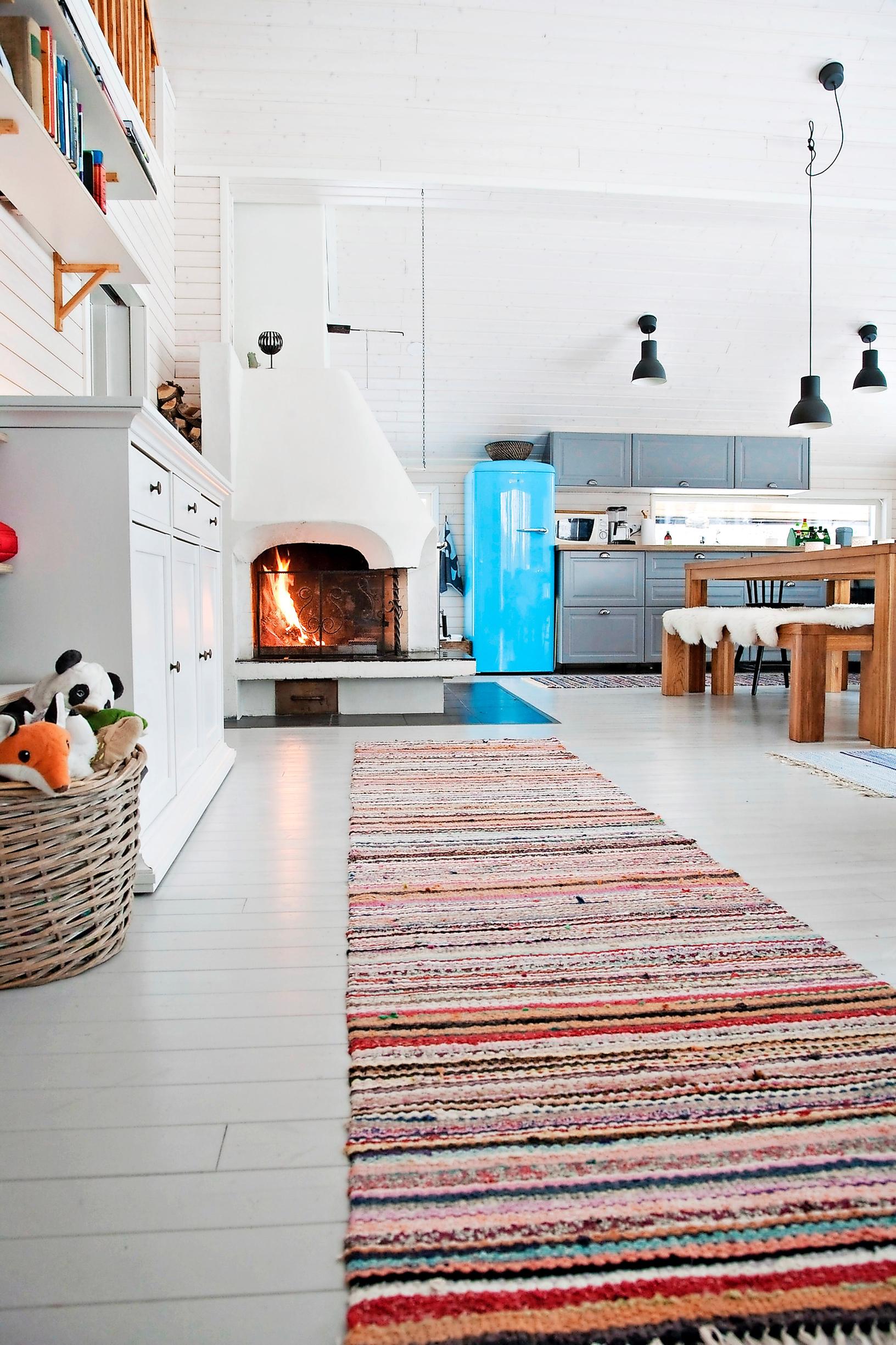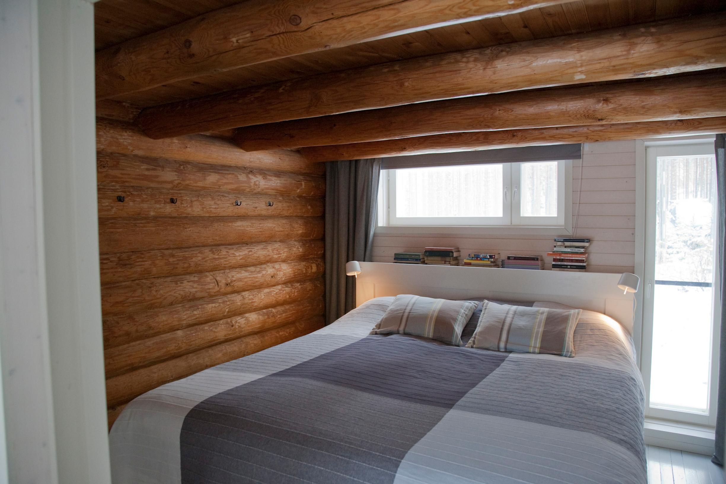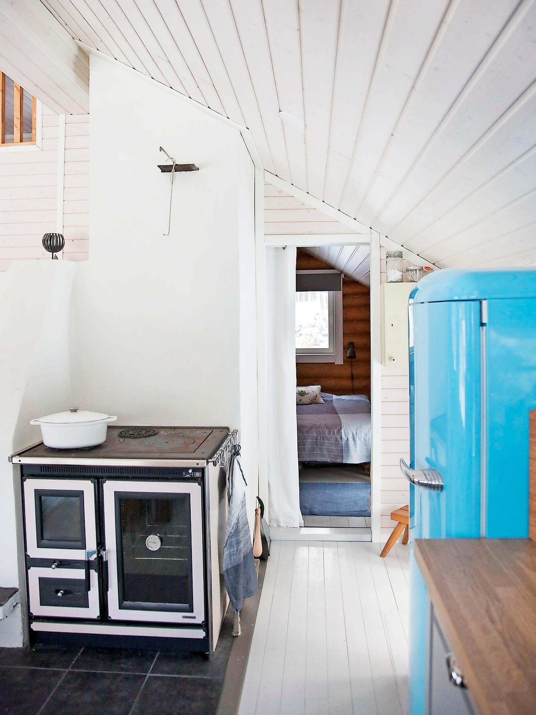 Vanhaa kattoa korotettiin toisesta laidasta, ja nosto toi mökkiin kaivattua tilan tuntua ja valoisuutta. Olohuoneen yhteyteen päätimme tehdä uuden avokeittiön. Vanhasta keittiöstä saatiin tilava makuuhuone.