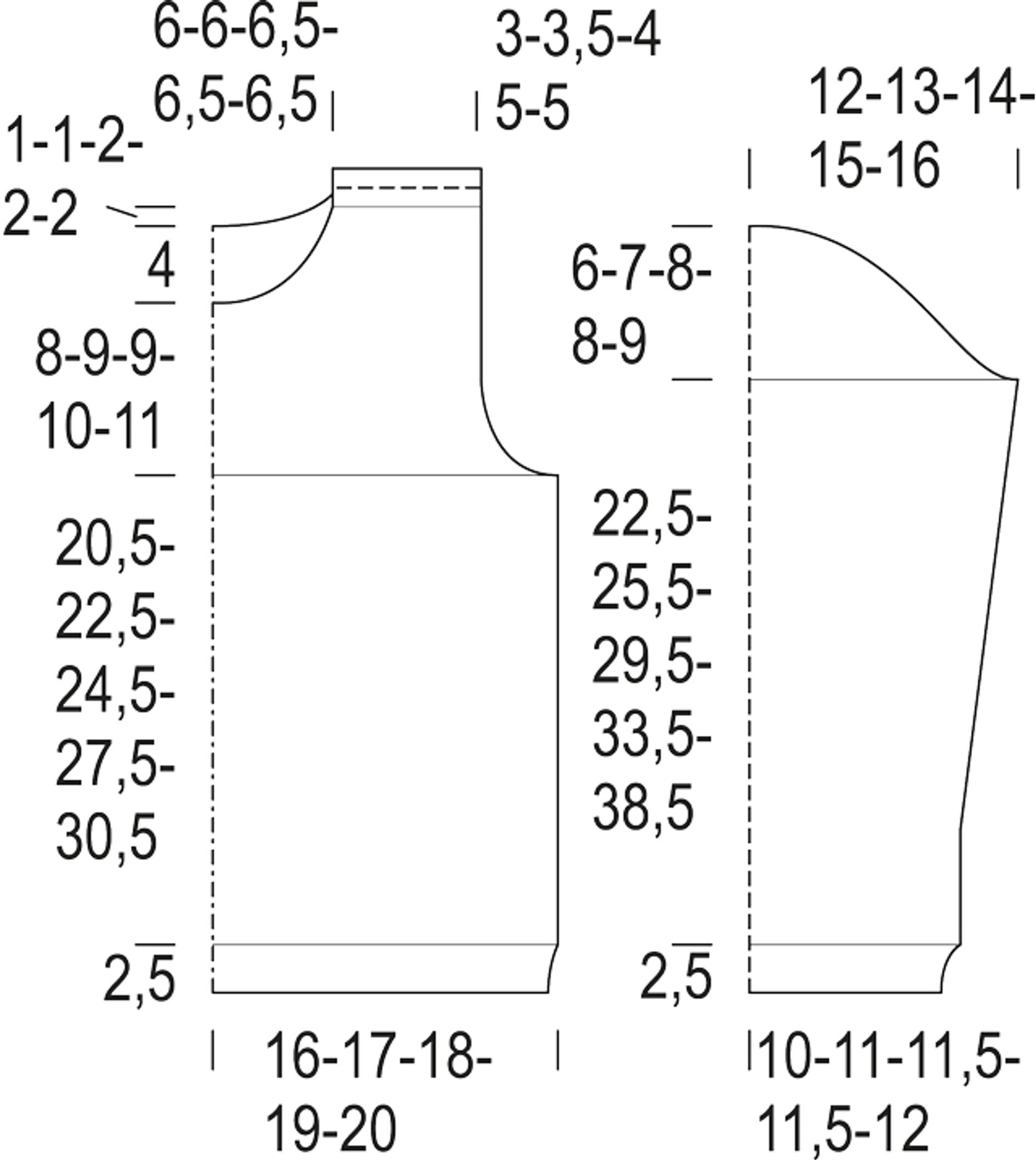 - Neulo oikea olka vastaavasti, mutta sileänä neuleena ja ilman napinläpiä. Päätä s:t, kun kädentien korkeus on 13(14)15(16)17 cm.