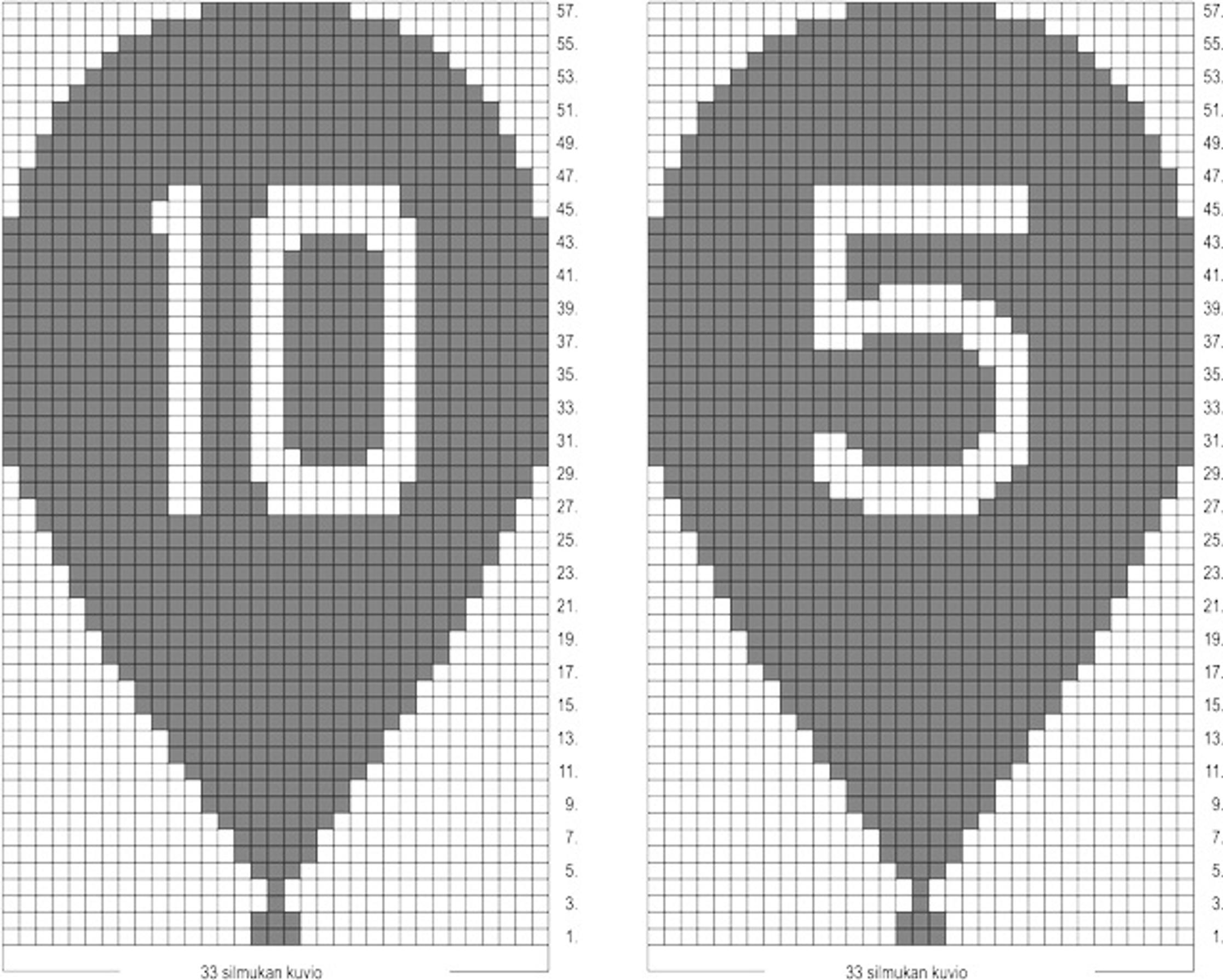 - Kirjo ilmapallon keskelle numero luonnonvalkoisella (nro 5) tai farkunsinisellä (nro 10) piirroksen mukaan silmukoita jäljitellen ja kirjo vielä naru tikkipistoin.