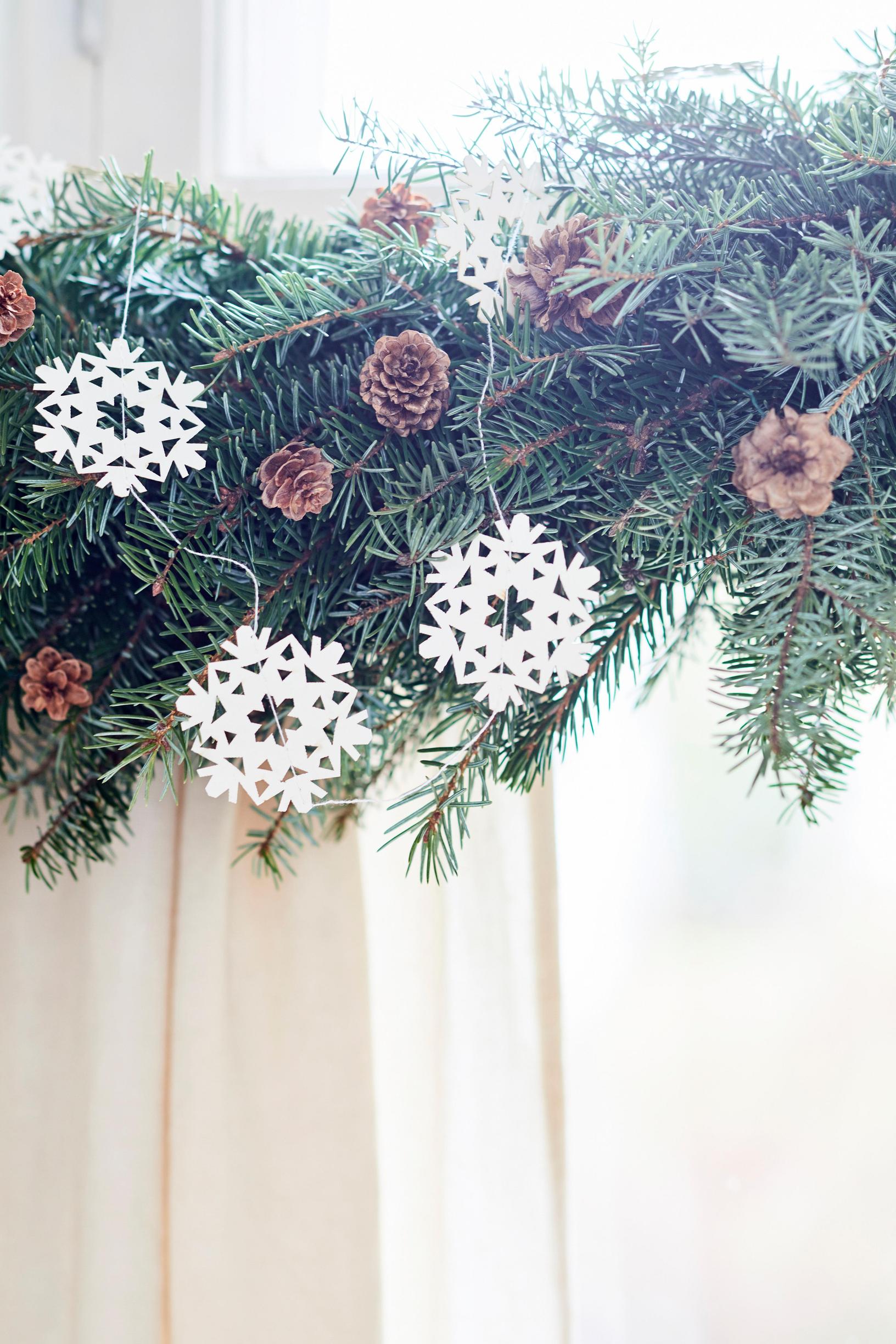 Rauhallinen ja maanläheinen kokonaisuus on tehty paperisella lumihiutalenauhalla ja kävyillä. Kieputa käpyihin pätkä rautalankaa ja kiinnitä kävyt sen avulla köynnökseen.