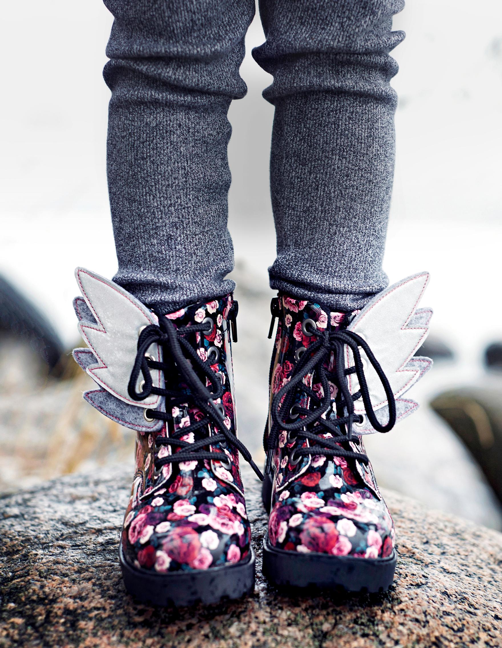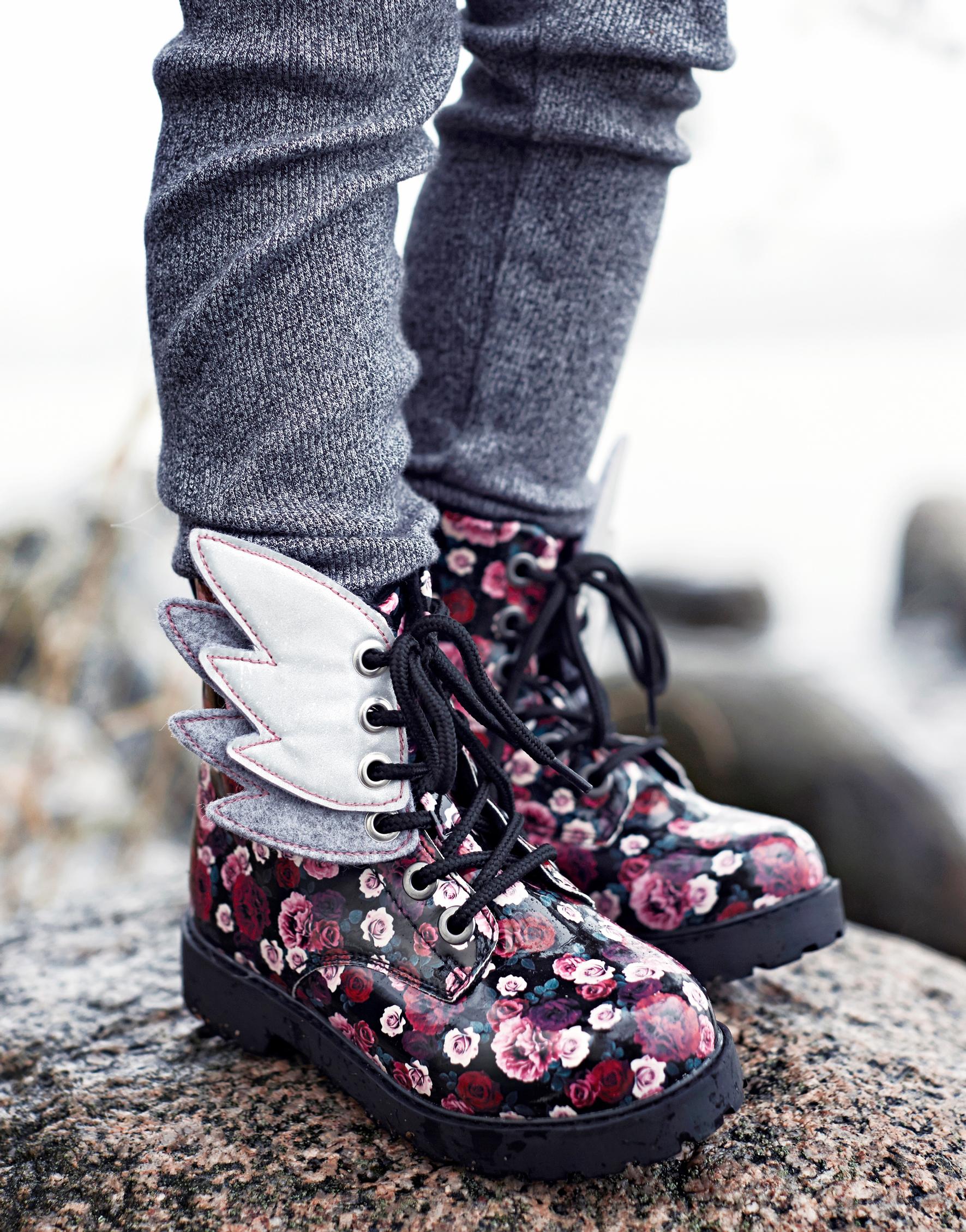 - Voit tehdä myös kaksi siipiparia. Pujota ne kenkiin lomittain, kuten kuvassa. Alimmat voit tehdä pelkästä pohjakankaasta samalla tavalla kuin heijastinsiivet.
