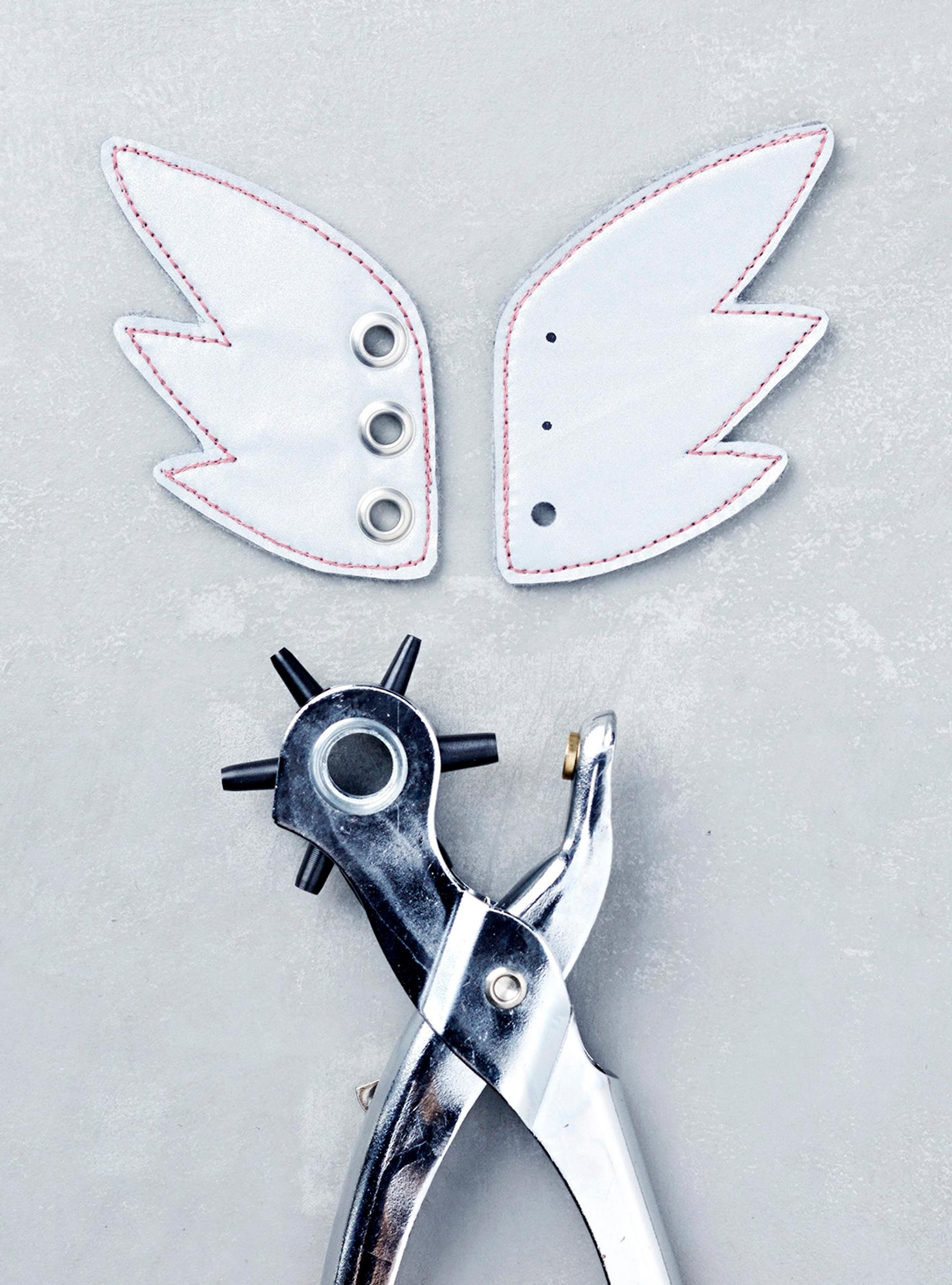 6. Tee siipiin kengännauhojen reiät reikäpihdeillä. Lyö sirkat reikien ympärille vasaralla pakkauksen ohjeiden mukaan. Pujota siivet kengännauhoihin.