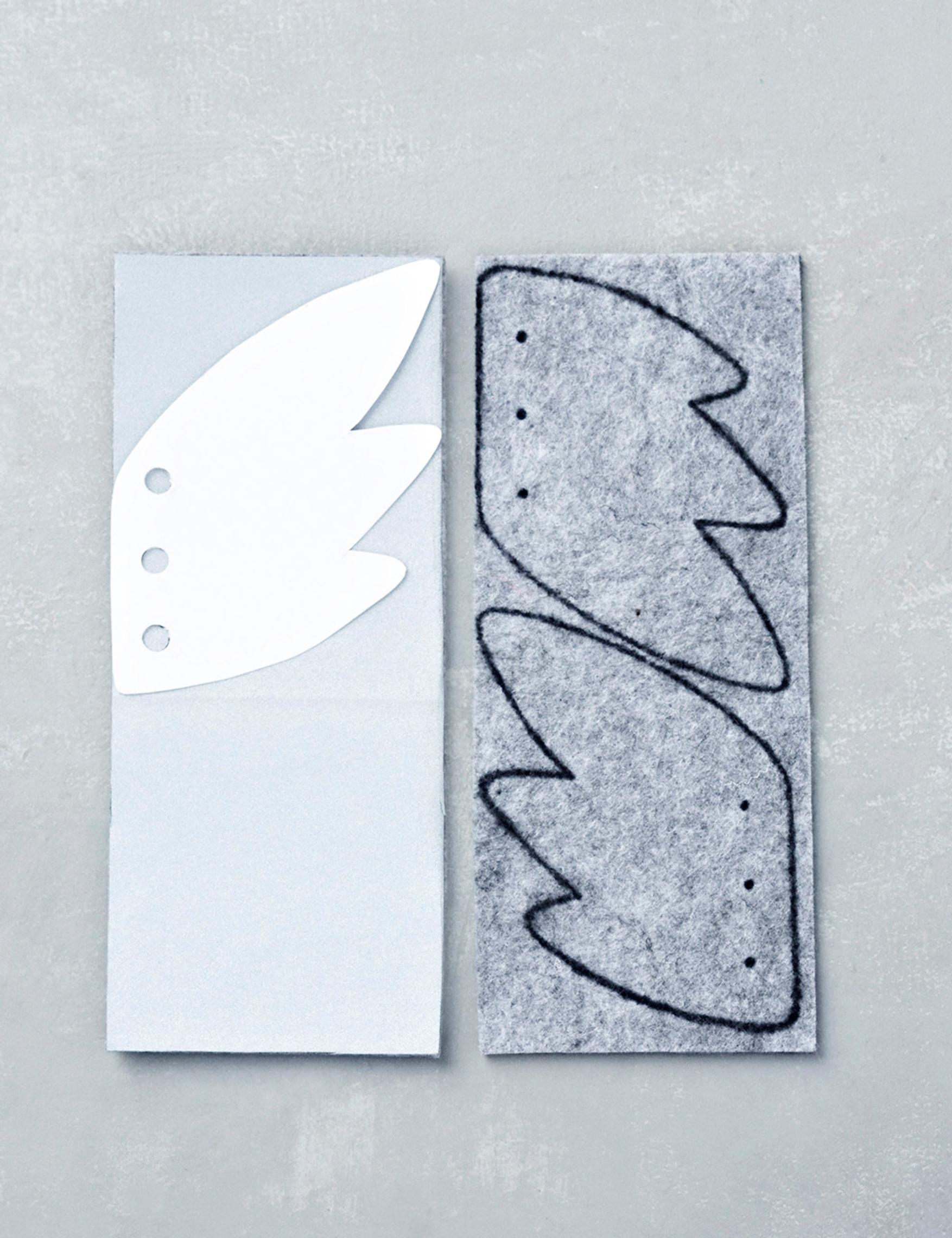 1. Piirrä siiven kaava kartongille ja leikkaa se irti. Mallaa kaavaa kengälle ja merkitse siihen kolme reiän paikkaa kengän nauhanreikien avulla. Tee reiät pihdeillä kaavaan.
