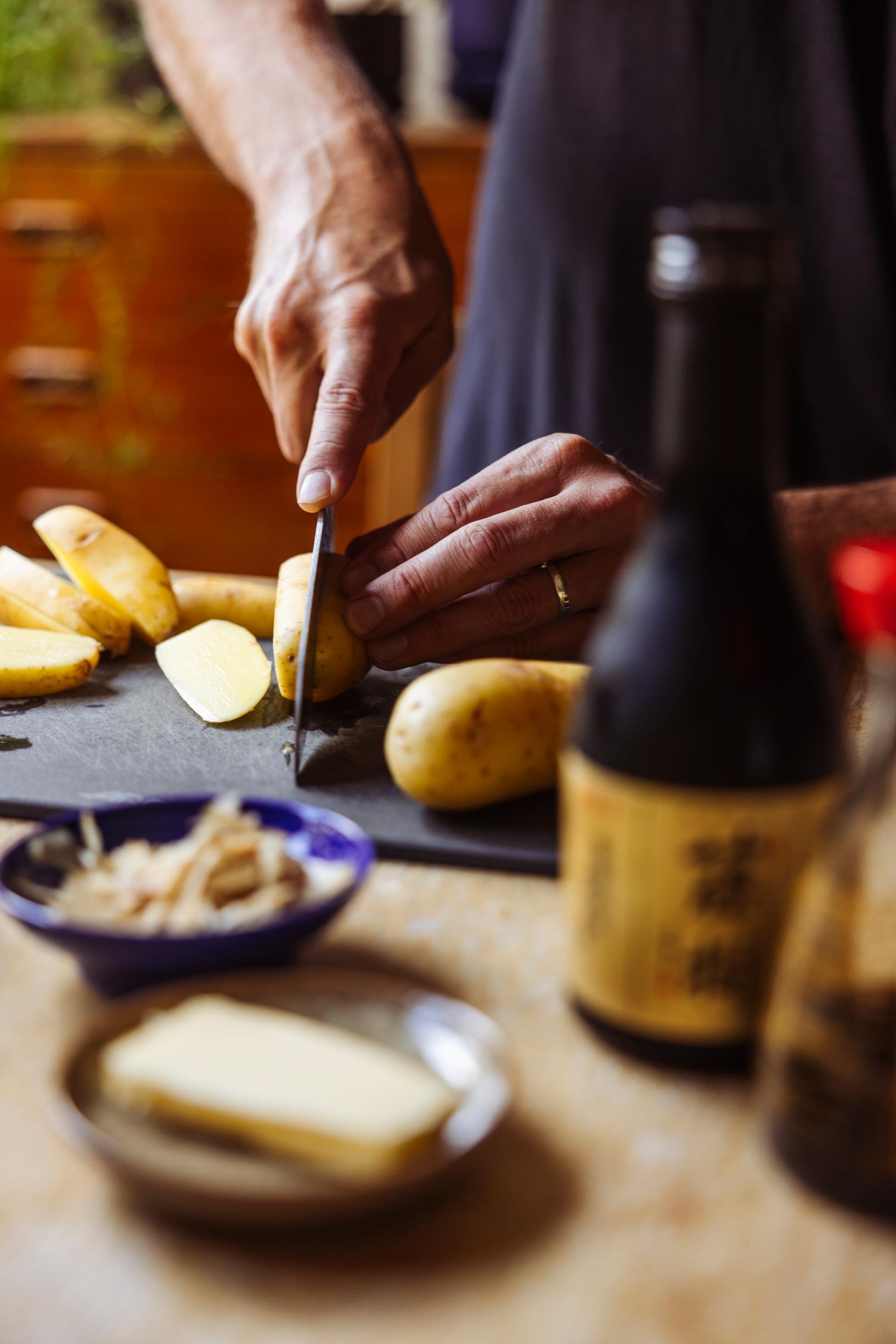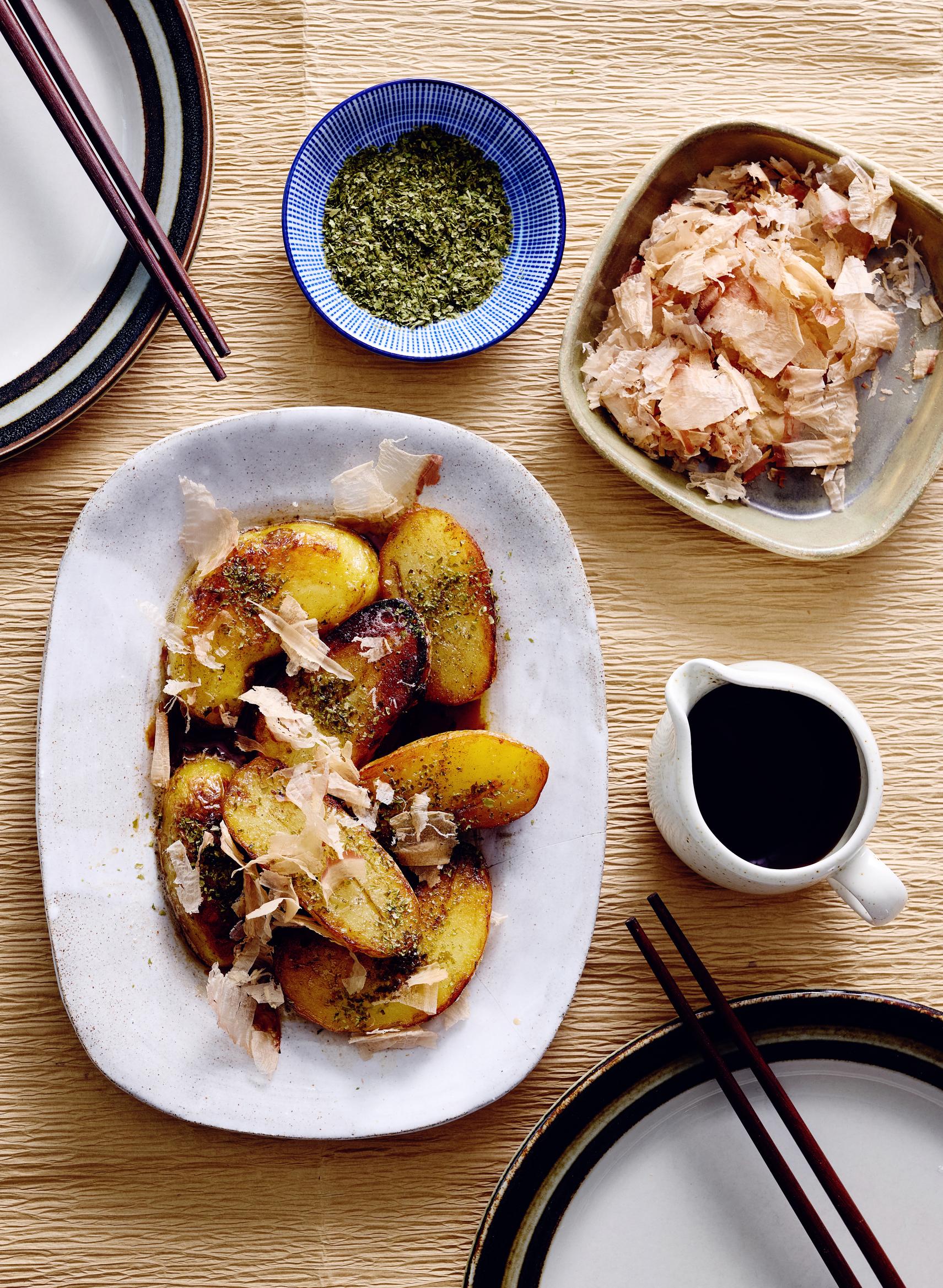 Peruna-annos on helppo valmistaa, mutta makuyhdistelmä on ylivertaisen hyvä. Katsuobushi eli kuivatut fermentoidut boniittilastut tuovat annokseen syvyyttä ja kermaista pehmeyttä.