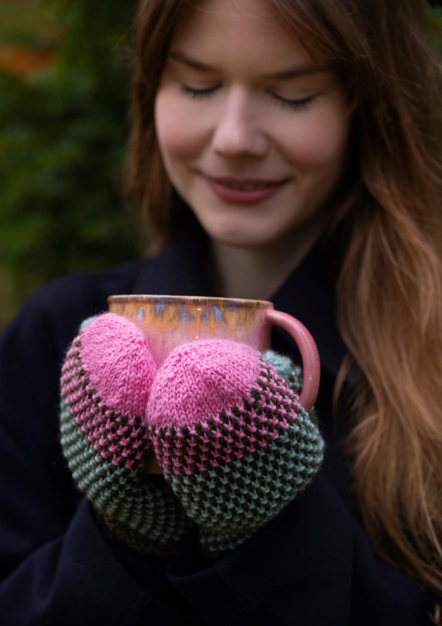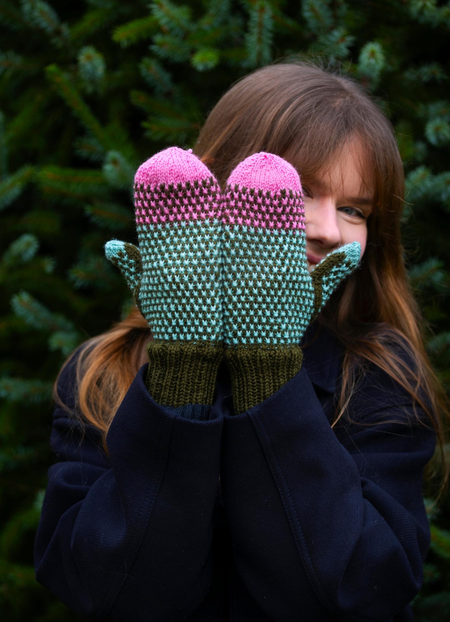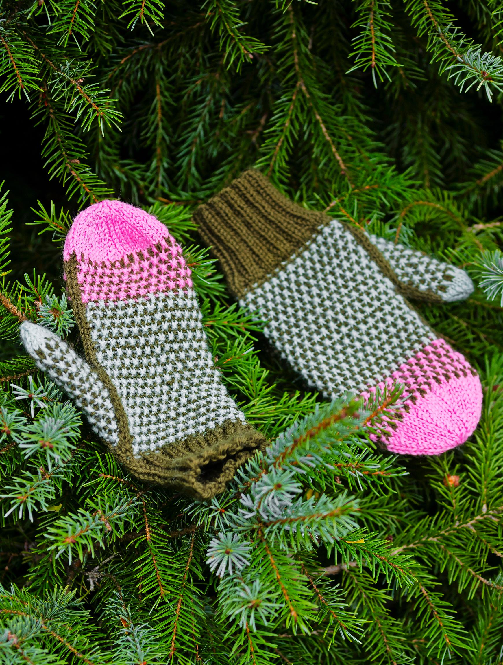Karkkiväreillä kuorrutetut lapaset pitävät kädet lämpiminä. Herkullisen näköinen kuvio muodostuu kirjoneuleena neulotusta pidennetystä helmineuleesta.