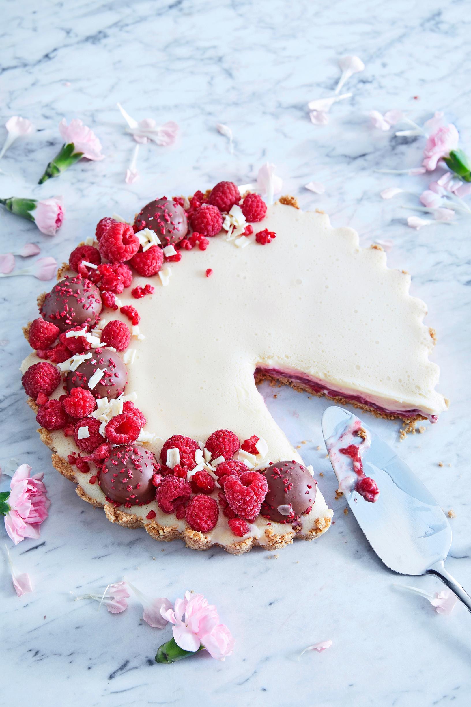 Valkosuklaisessa vadelmapiirakassa on vain kuusi raaka-ainetta mutta suloista makua monin verroin. Piiraan valmistaminen vie vain parikymmentä minuuttia, minkä jälkeen se jätetään pariksi tunniksi jääkaappiin tekeytymään. Jos sinulla on kiire, sujauta piiras jääkaapin sijaan hetkeksi pakastimeen.