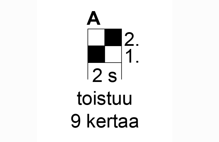 - 3. krs: Neulo kuten 2. krs. Pidä langat edessä koko kerroksen ajan, mutta ota langat työhön päinvastoin: *ota valkoinen lanka työhön harmaan alta ja neulo sillä 1 n, ota harmaa lanka työhön valkoisen alta ja neulo sillä 1 n*, toista *–* krs loppuun.