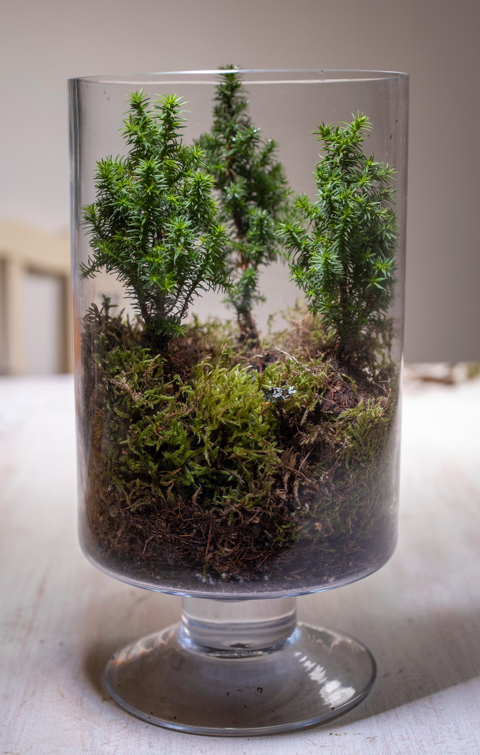 Sypresseistä tai niiden versoista ja sammalesta luot helposti minikokoisen metsän lasimaljaan. Sumuttelu virkistää neulasia ja luo utuisen metsän tunnelmaa.