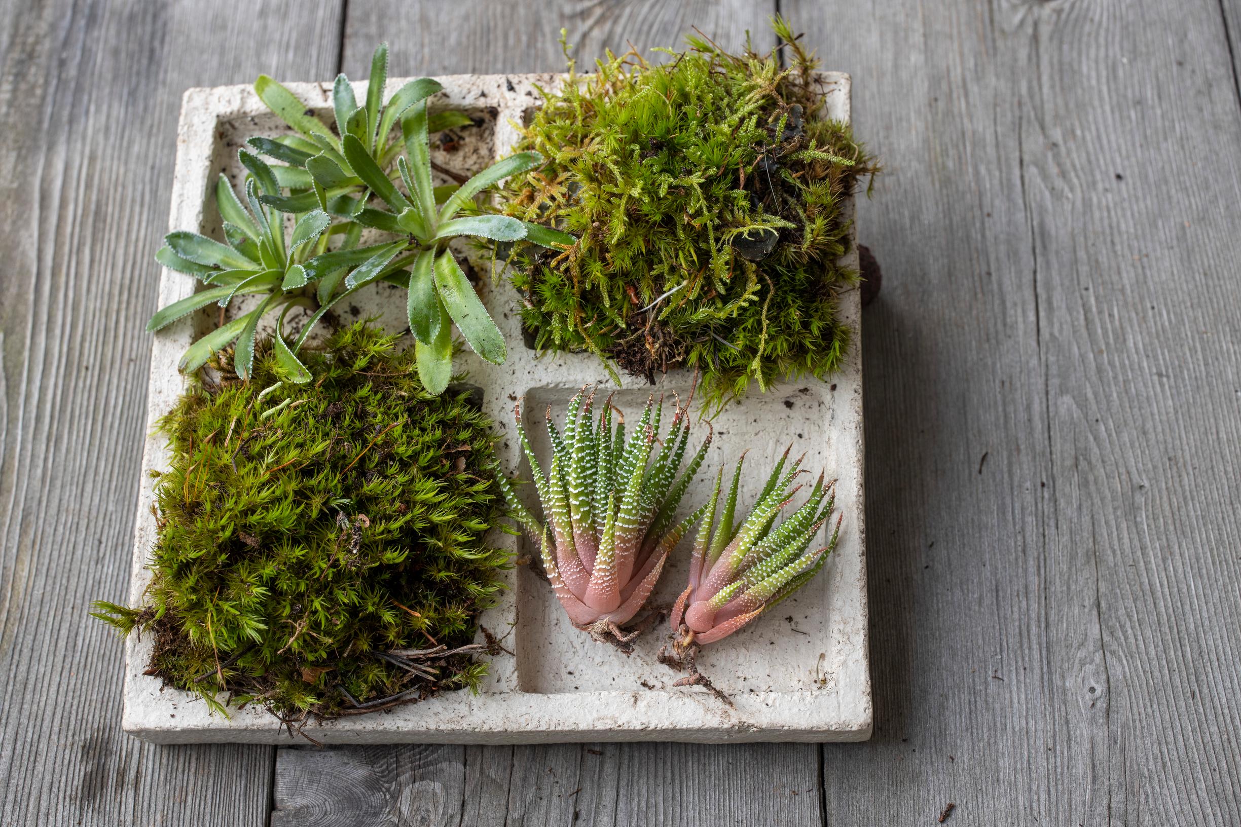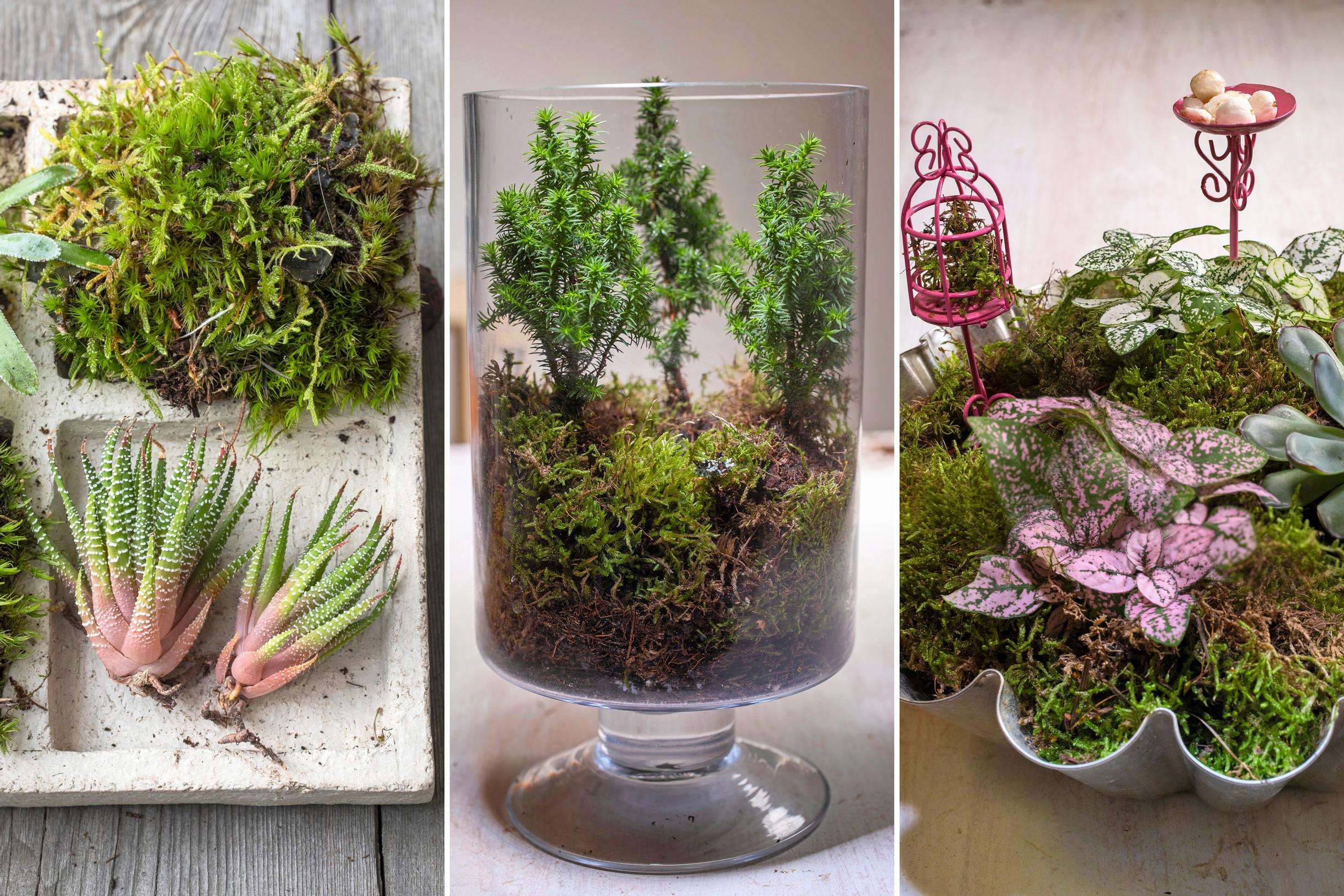 Pienissä ruukuissa myytävistä sypresseistä, pilkkulehdistä ja mehikasveista voi loihtia kauniita asetelmia erilaisiin astioihin. Käytä kaverina sammalta.