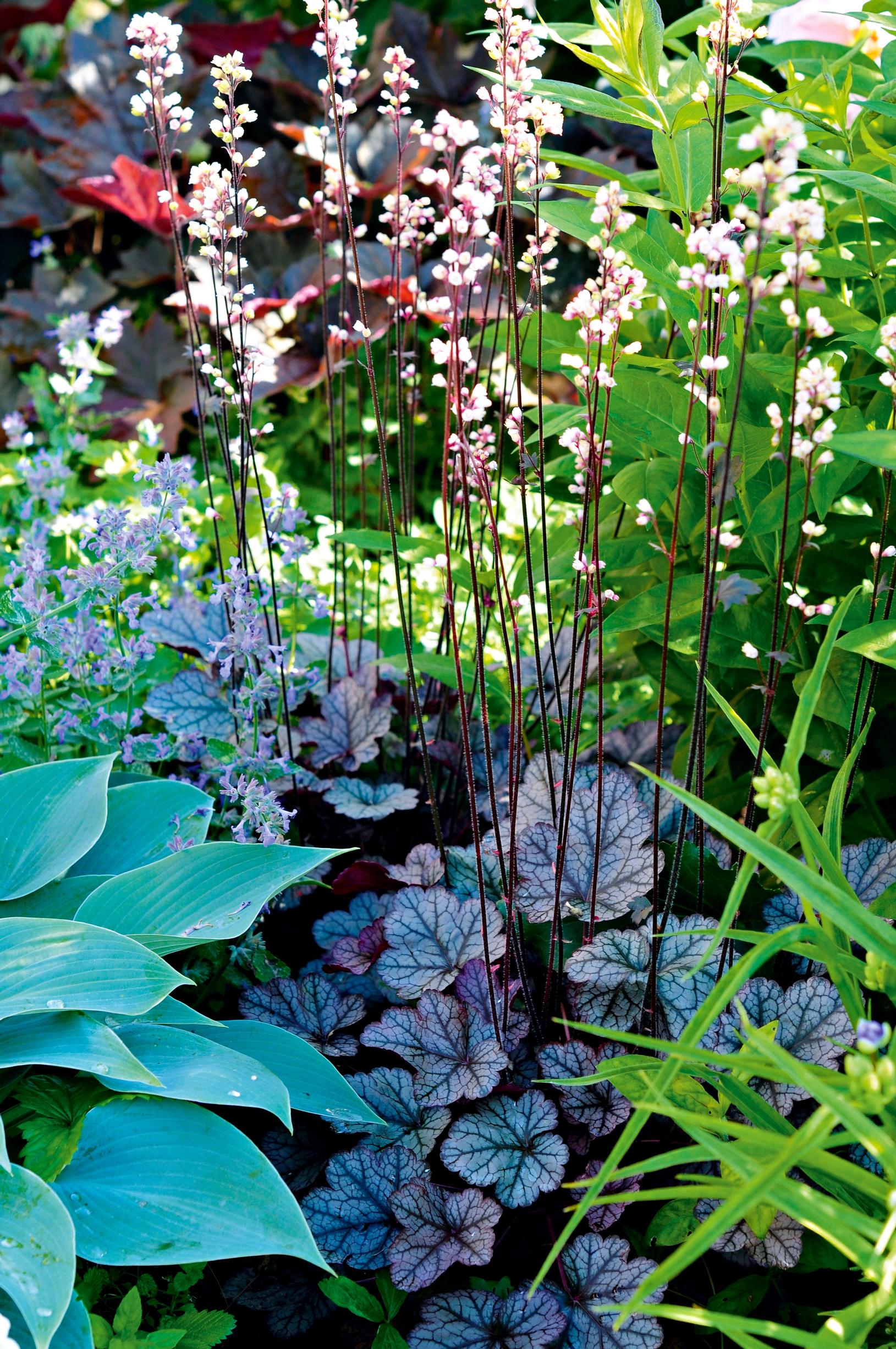 Kuka tarvitsee kukkia, kun pelkät lehdet ovat niin hurmaavia? Keijunkukan lehtien värityksen ja kuvioinnin kirjo on huikea. Istuta Heuchera ravinteikkaaseen maahan. Kuvassa alla purppurakeijunkukka. Koko ja kukinta-aika lajikkeen mukaan. Aurinko–puolivarjo, 20–50, 6–9.