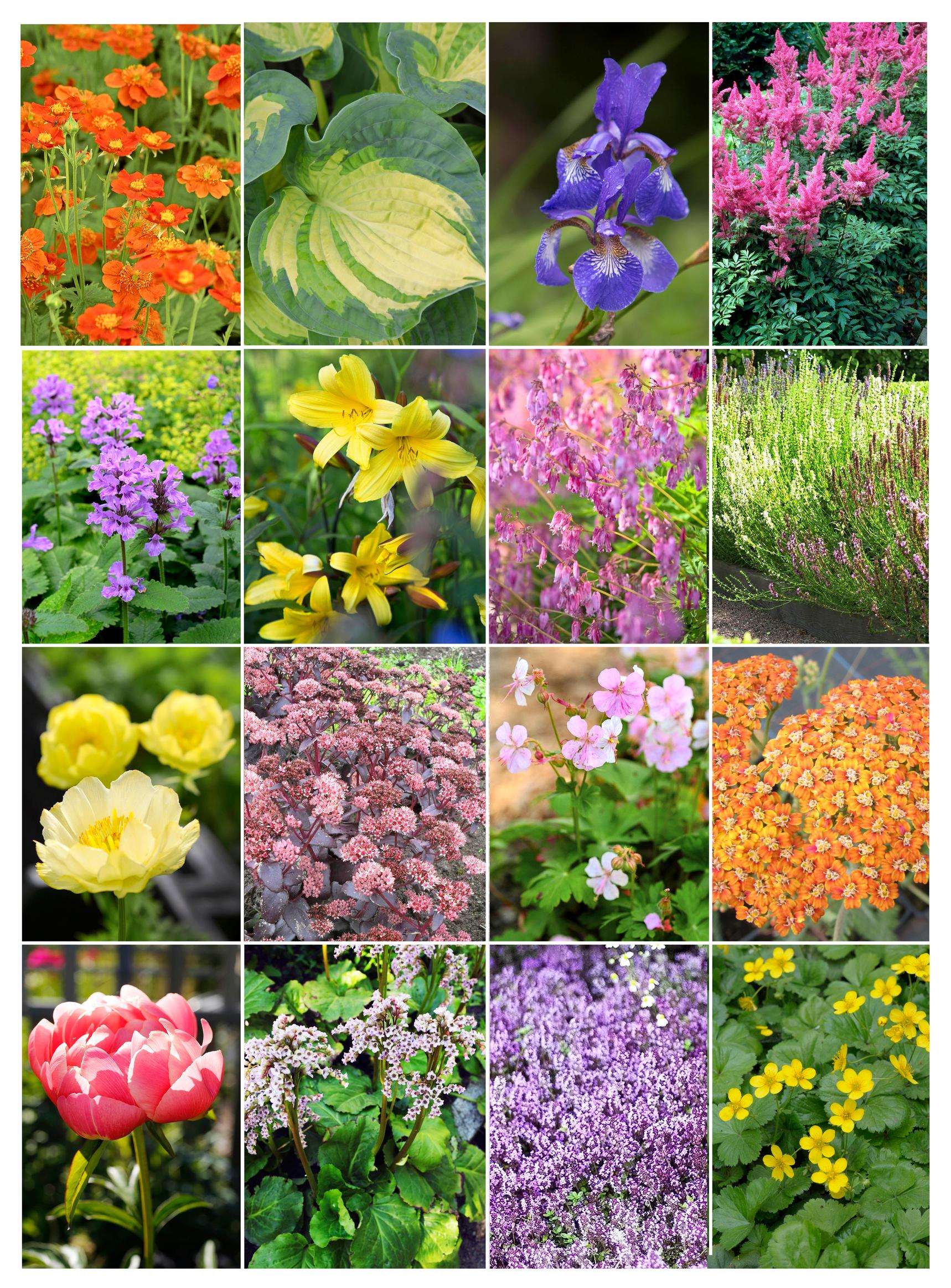 Töyhtöangervot, täpläleimu, syysleimu, koristekastikka, sinipallo-ohdake, kimikit, hohdekukat, nauhukset, kevätvuohenjuuri, kevätkaihonkukka, sammalleimut, kaunosilmät, päivänhatut.