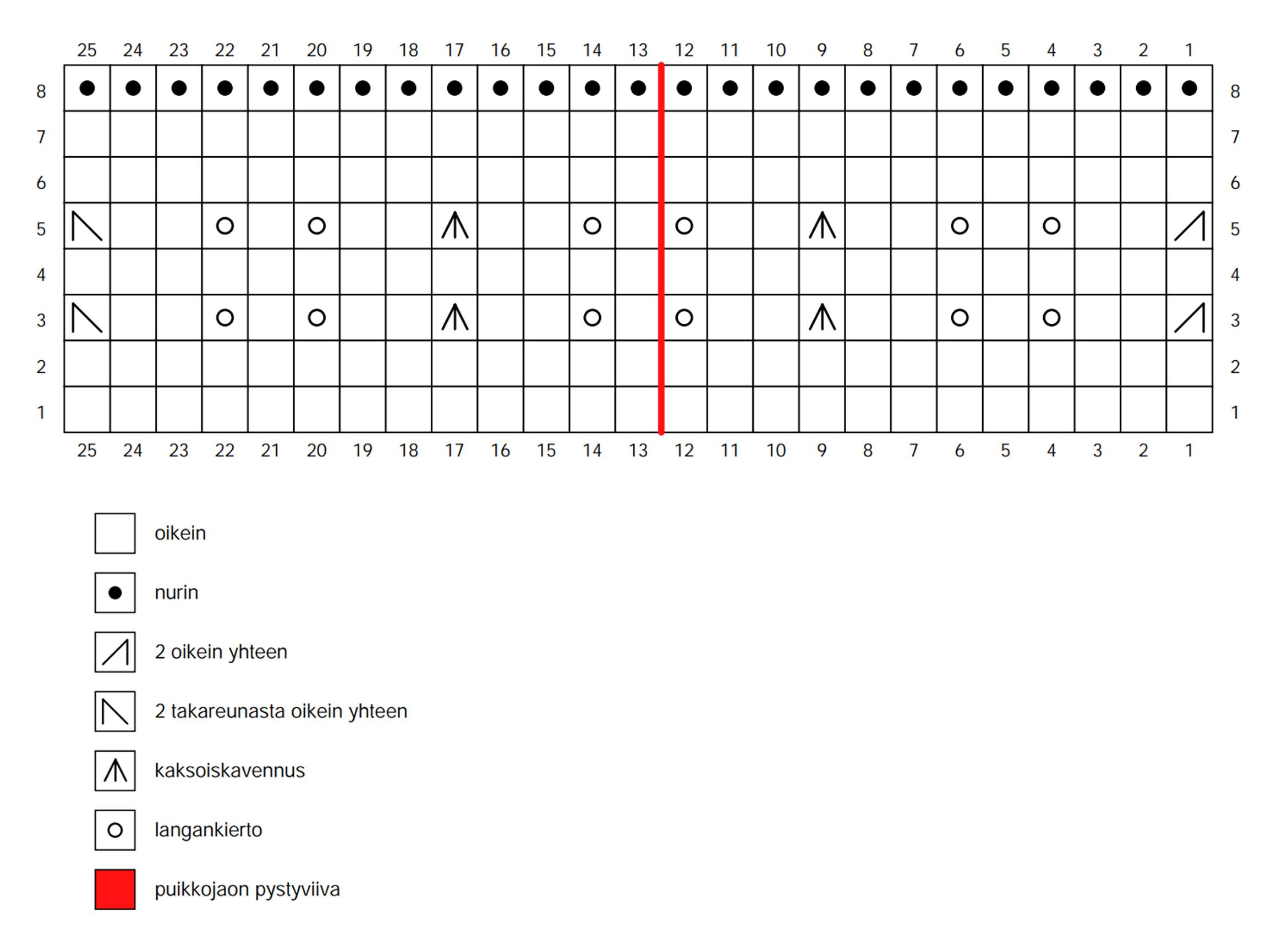 1. krs: Neulo oikein, kunnes 1. puikon lopussa on 2 s jäljellä, neulo ne oikein yhteen. Jatka 2. ja 3. puikolla kaavion B 1. krs:n mukaan (toistaen jatkossa krs:ia 1–8), 4. puikon alussa 2 tr o yhteen, loput s:t oikein.